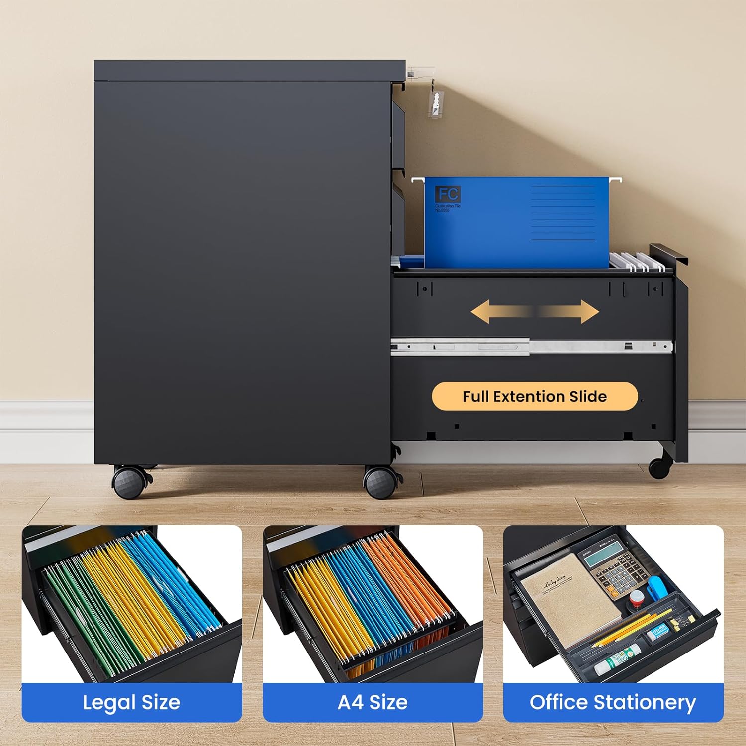 • 【3 Drawer Filing Cabinet】: 3 drawers storage with removable pencil trays and adjustable hanging bars which can hold letter, legal, and A4 size hanging files. Two shallow drawers are the ideal size to store stationery of different types.