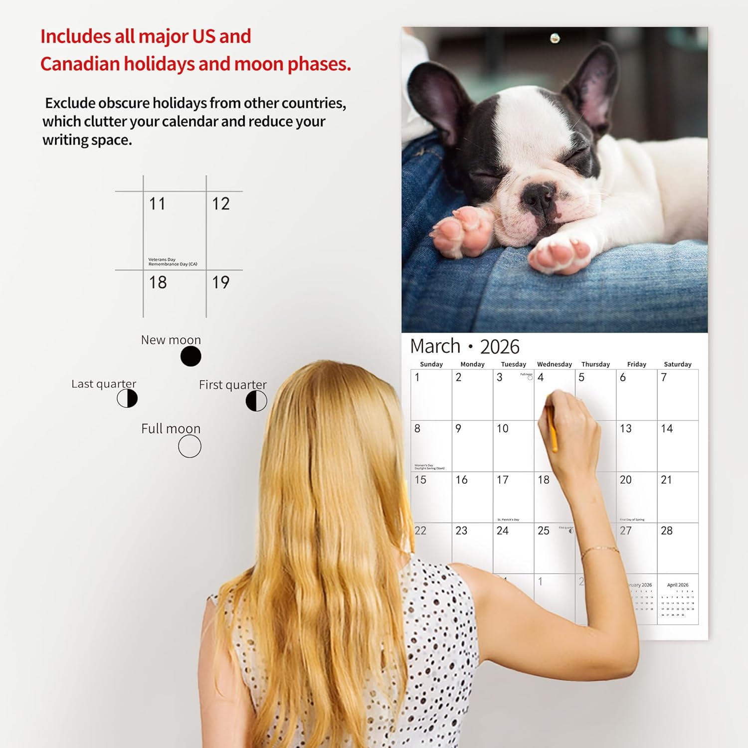 • PROFESSIONAL CONTENT DESIGN - You'll love the feeling of bringing order and organization to your life.Oversized everyday blocks (1.5" x 1.9") give you extra space to jot down tasks and appointments. Includes all major US and Canadian holidays and moon phases. Exclude obscure holidays from other countries, which clutter your calendar and reduce your writing space.Size Closed: 12 x 12 inches.Size Open: 12 x 24 inches.