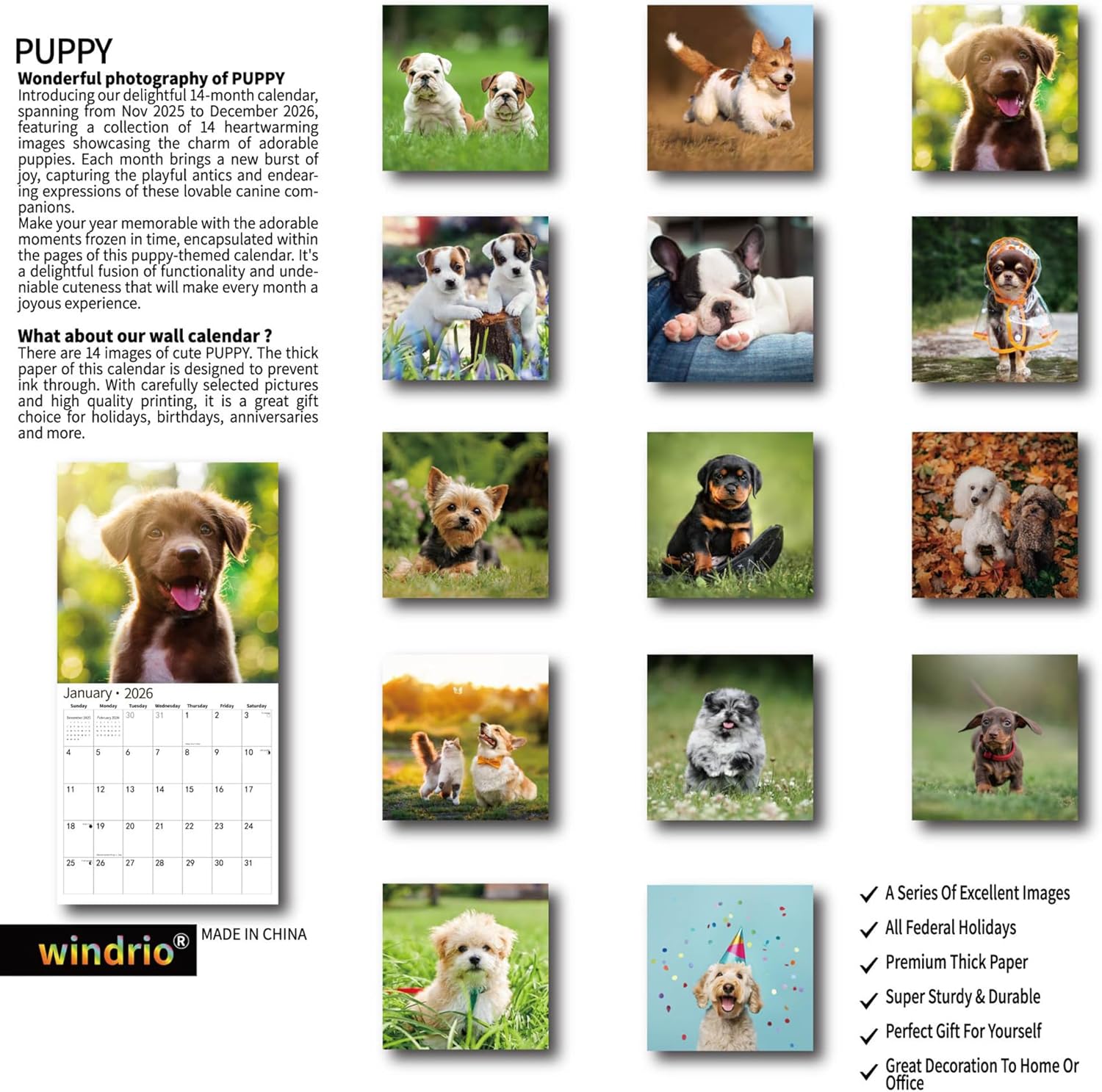 2026 Wall Calendar,Calendar 2026, November 2025 - December 2026, Wall Calendar Puppy Dog, 12" x 24" Opened,Full Page Months Thick & Sturdy Paper for Calendar Organizing & Planning
