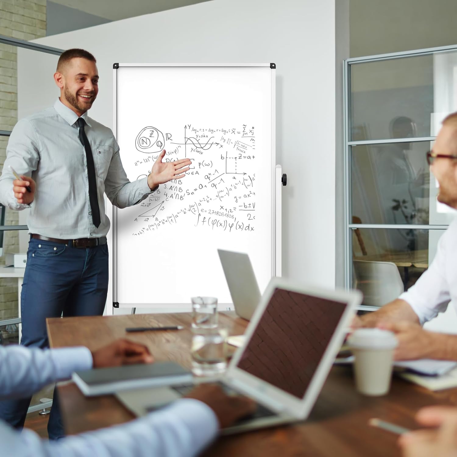 • Robust and Mobile: Built with a sturdy aluminum frame and four steel casters, our whiteboard ensures smooth 360° rotation and easy mobility. Engage the brakes for added stability during use.
