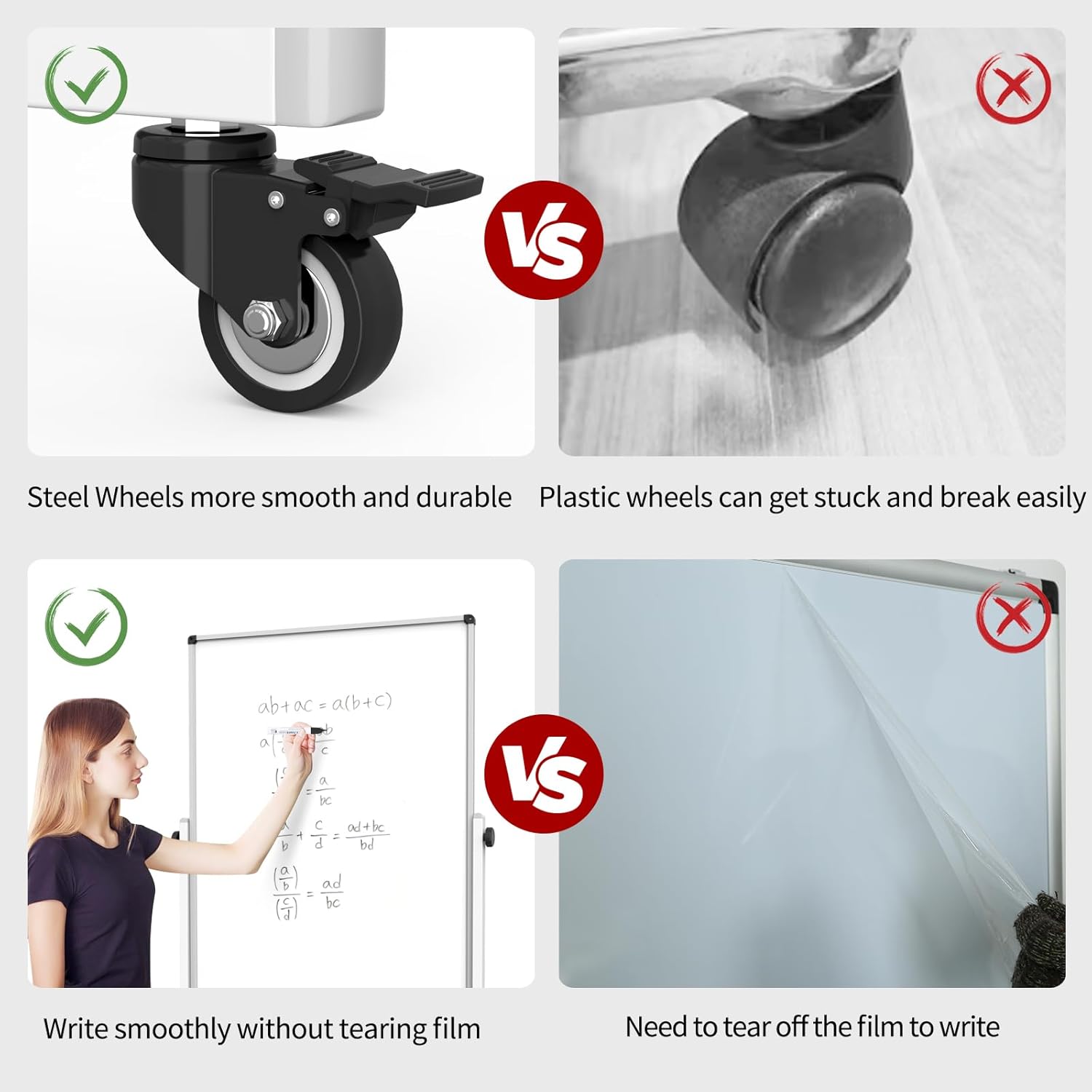 • Robust and Mobile: Built with a sturdy aluminum frame and four steel casters, our whiteboard ensures smooth 360° rotation and easy mobility. Engage the brakes for added stability during use.