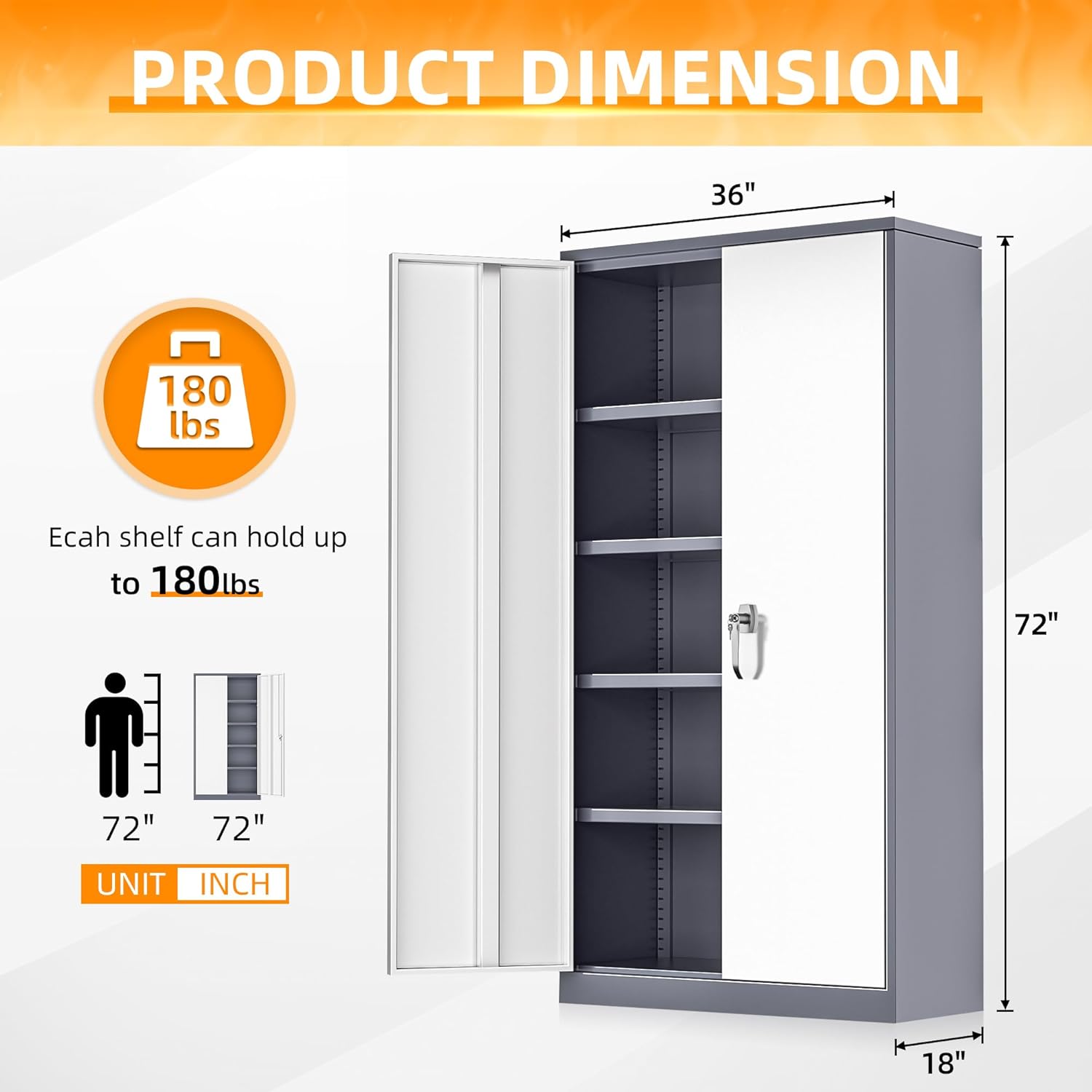 • 【Large Capacity】: Tall steel storage cabinet with 4 adjustable shelves, meets your different needs of the placing item. And also each shelf can load up to 180lbs, can be removed or adjusted. 2 Locking keys and 3-pointed locking system highly secure your belongings