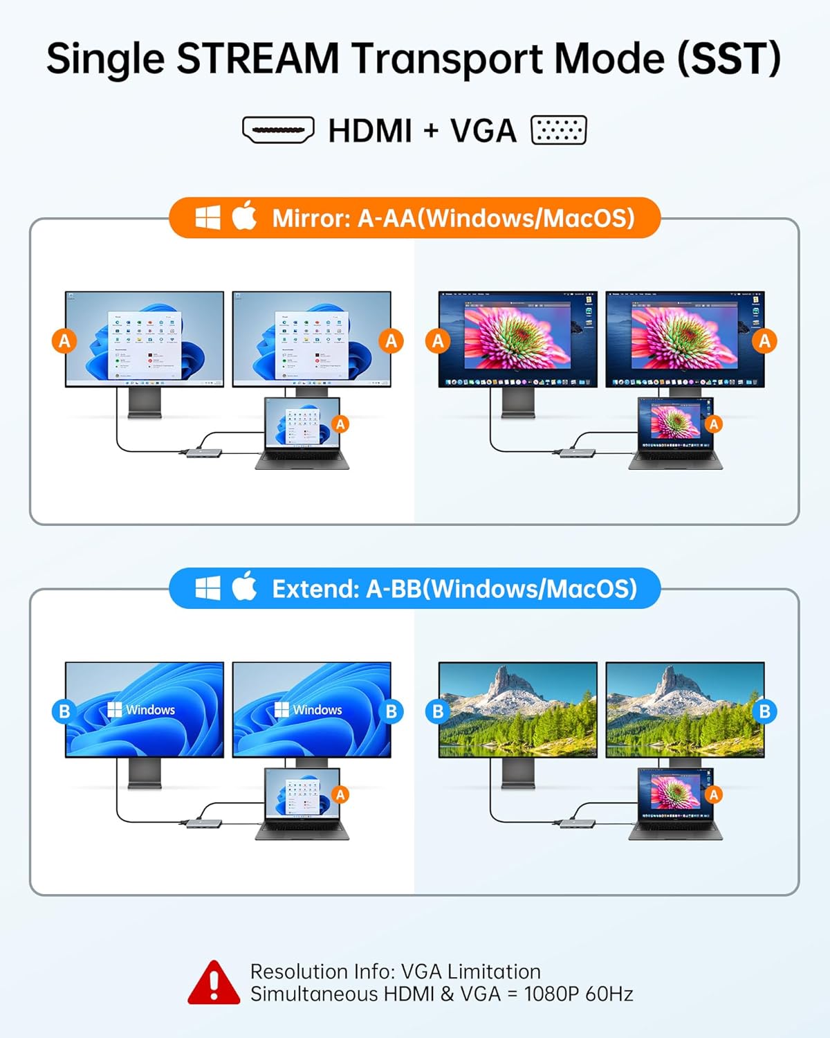 • 𝗦𝘁𝘂𝗻𝗻𝗶𝗻𝗴 4K@60Hz HDMI & VGA Output: Easily extend or mirror your display with the USB C to HDMI adapter supporting 4K@60Hz resolution, or connect older displays via the VGA port with Full HD 1080p, making this USB C hub HDMI ideal for work presentations, streaming, or multitasking.