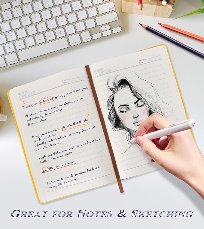 • 【256 Pages Premium Paper】We use 256 Pages (128 Sheets) 80Gsm acid-free paper thick lined paper,Line spacing 8.5mm,so you can confidently use most pens, pencils, and markers without ghosting and bleed-through.The Light yellow paper resists damage from light and air and the paper protects your eyes from irritation.