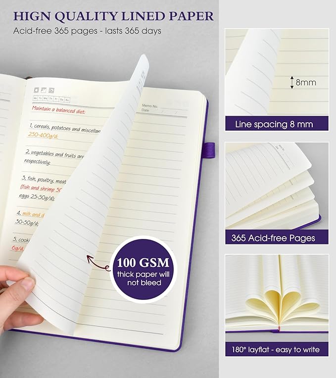 • 【365 Pages Premium Thick Paper】: Our PERCUN lined journal notebook is made of 365 pages high-quality 100Gsm thick ruled pager with an acid-free light Ivory paper that is thicker than normal. This premium quality paper will not cause bleeding, ghosting or smudging and is suitable for most types of pens,provides ample space for journaling, note-taking, and creative writing. The line spacing is 7mm, making it easy to write legibly and neatly.