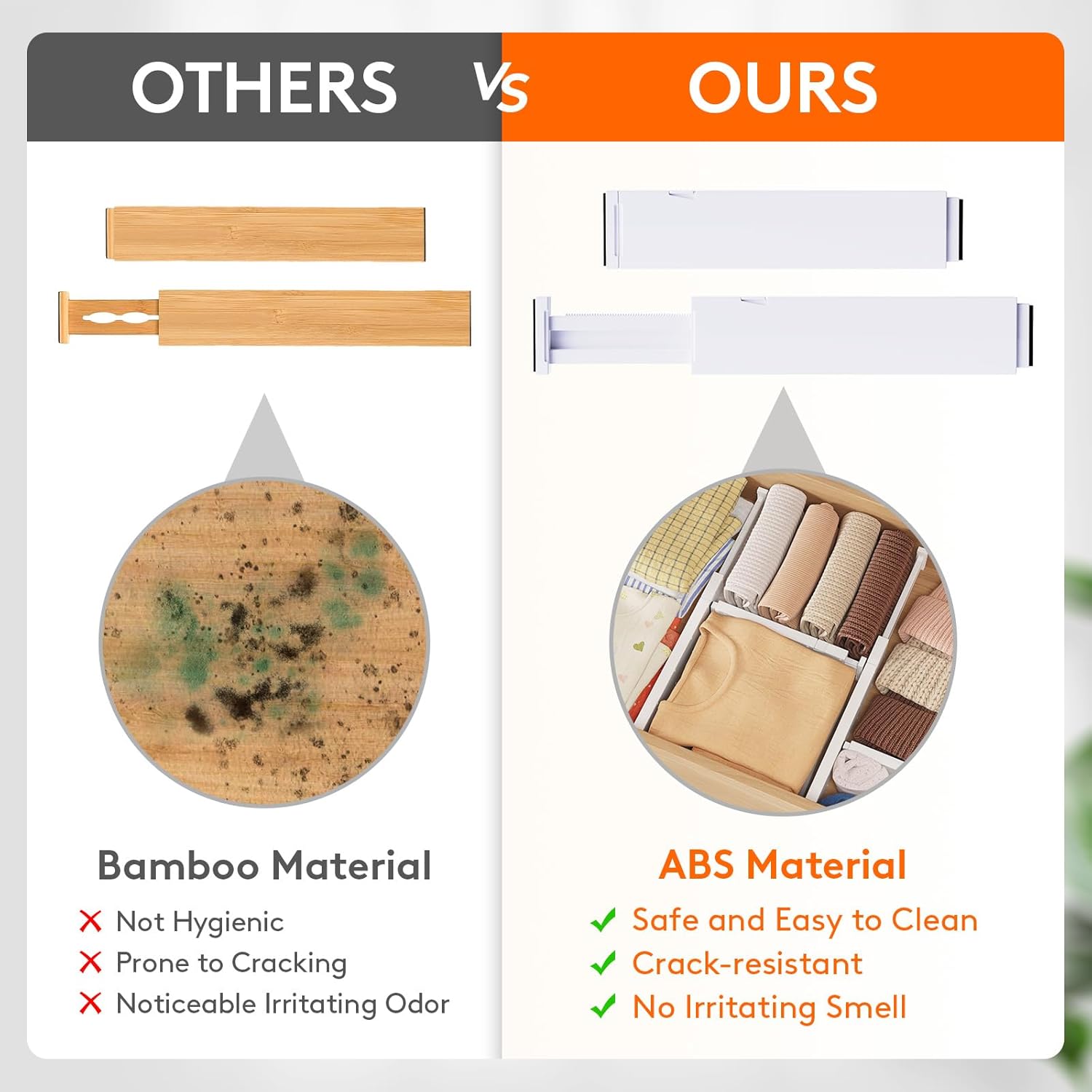 • Premium Material: Our adjustable drawer divider is made from high-quality ABS material, which is more sturdy for long-term use and crack-resistant than wooden material. Both ends are designed with premium EVA foam to prevent scratches and damage to the drawer walls