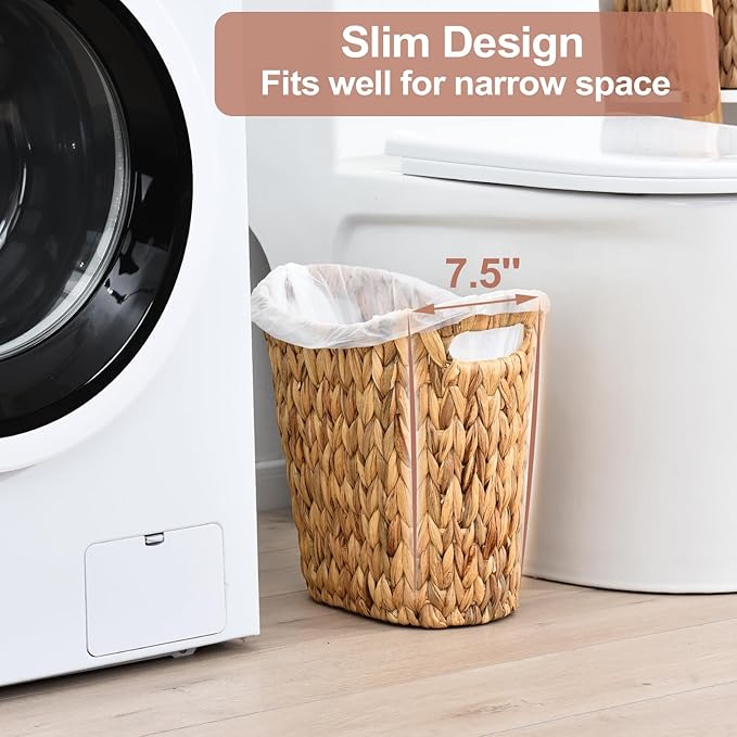 FairyHaus Wicker Trash Can with Handles, Natural Water Hyacinth Wicker Waste Basket, Handwoven Wicker Trash Basket for Bathroom Bedrooms, 13" L x 7.5" W x 12.2" H