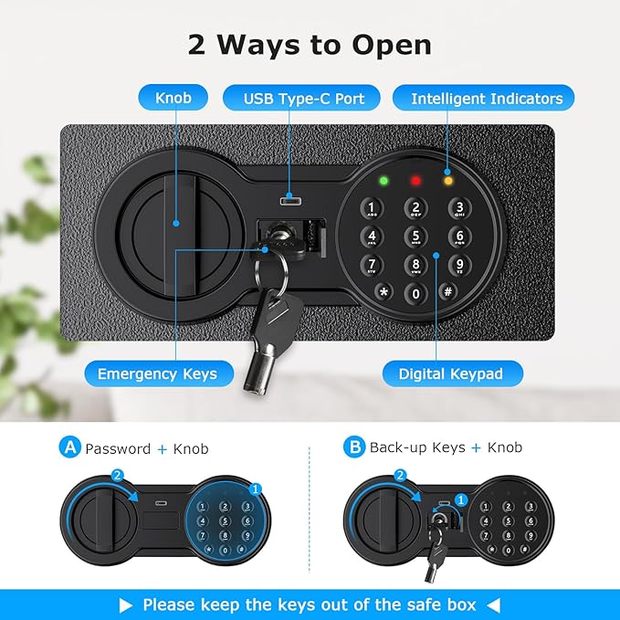 • 2 Ways to Open: This home safe is equipped with a electronic keypad lock that opens by entering a 3-8 digit personal code and also comes with 2 emergency keys in case you forget your code. This digital safe is also thoughtfully equipped with a Type-C port for charging the electronic keypad lock, so you won't have to worry about the lock's batteries dying and not opening