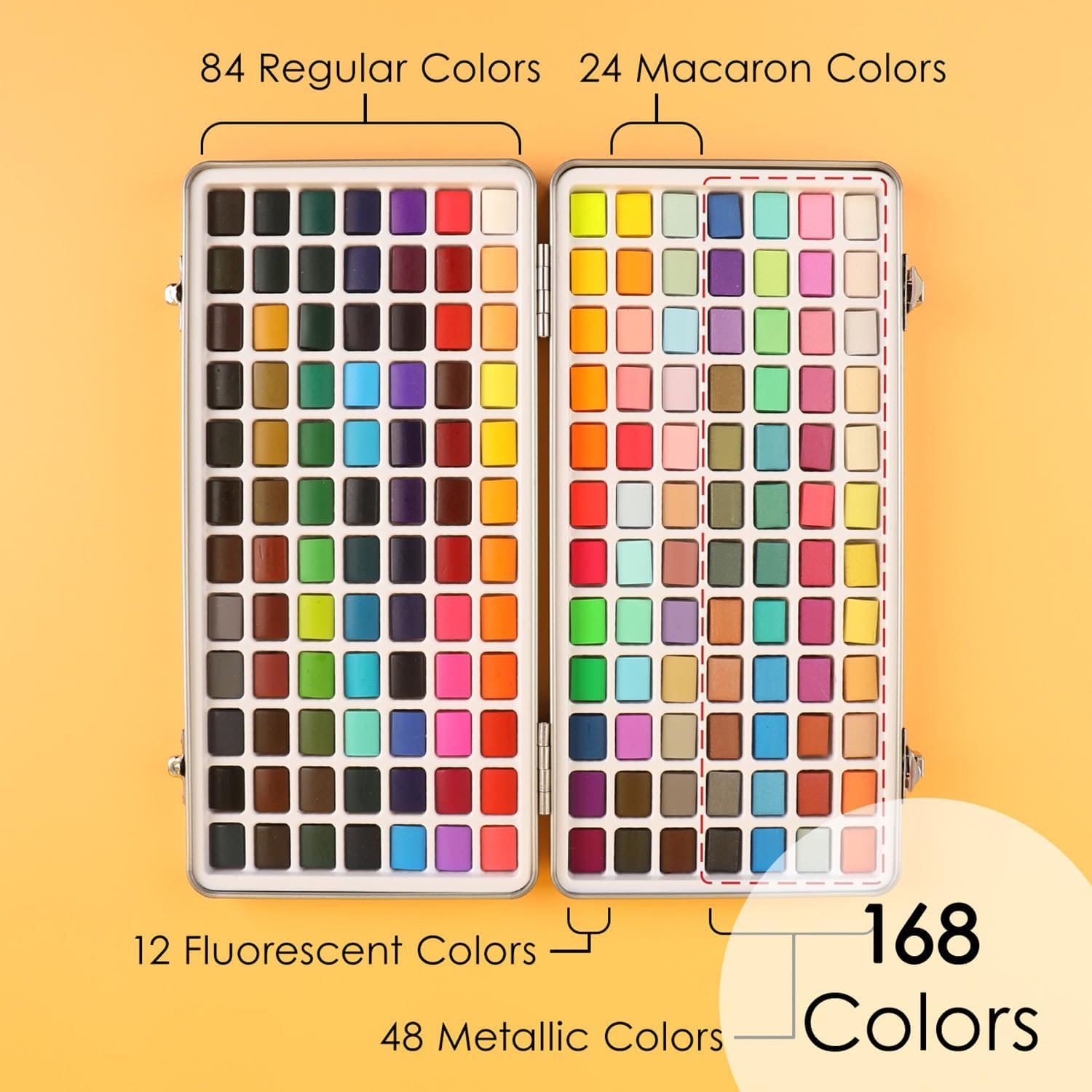 • Multicolor Watercolor Set: includes 84 regular colors, 48 metallic colors, 12 fluorescent colors, and 24 macaron colors, totaling 168 colors. Using high-quality pigments, apply smoothly and evenly. Suitable for various purposes such as design, still life painting, and artists of all levels.