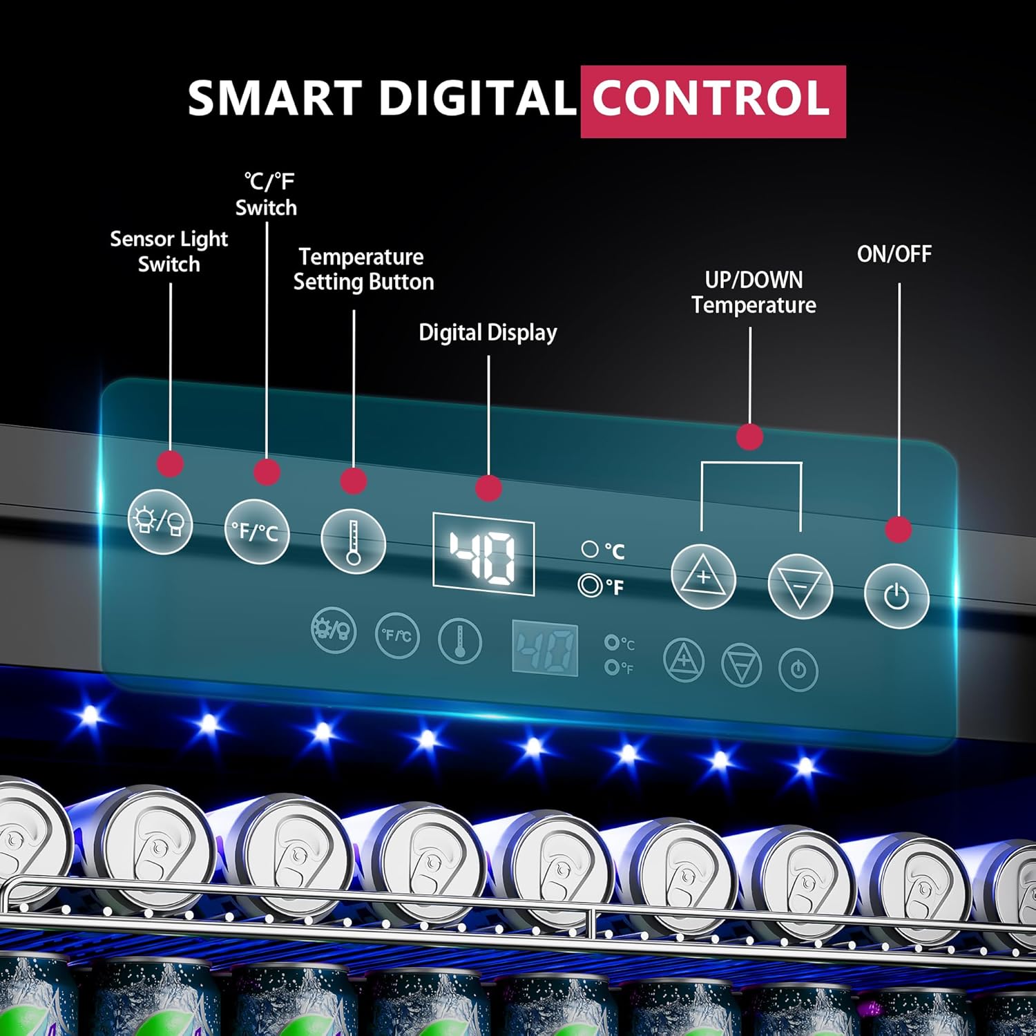 • 【Sensor light & memory function】 - The undercounter refrigerators are equipped with an energy-saving blue LED sensor light, which lights up when the door is opened (can be set to always light up) The digital touch panel has a built-in memory function, which will automatically restore the last set temperature when the beer cooler restarts after a power failure. The bottom of the drink refrigerator is also equipped with a hidden door lock, effectively preventing others from opening the door at will