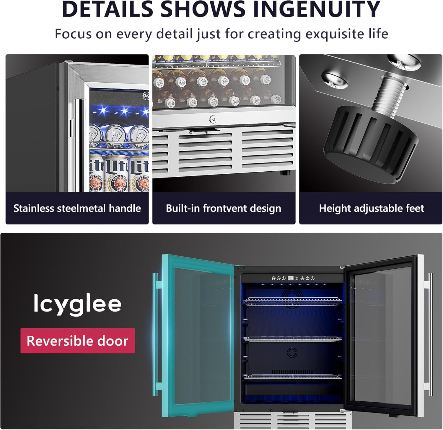 • 【Built-in Design】-The under counter fridge has a unique front ventilation design that allows for air circulation without the need for extra space on the sides or back. The built-in feature of the beverage fridge with glass door will save a lot of space in your kitchen, especially suitable for installation in kitchens, living rooms, garage. Product size 22.6"D x 23.4"W x 34.25"H