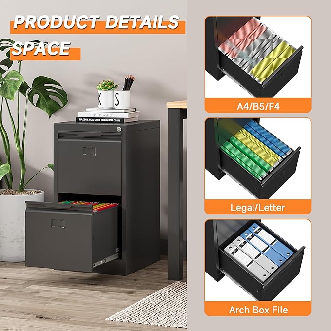 • 【Sturdy and Durable】Metal file cabinet drawers crafted from steel material, designed to be durable and suitable for all your storage needs. With a powder coating process that bonds and bakes the protective coating to the bare metal, the 2 drawer file cabinet with lock forms an effective barrier against corrosion.