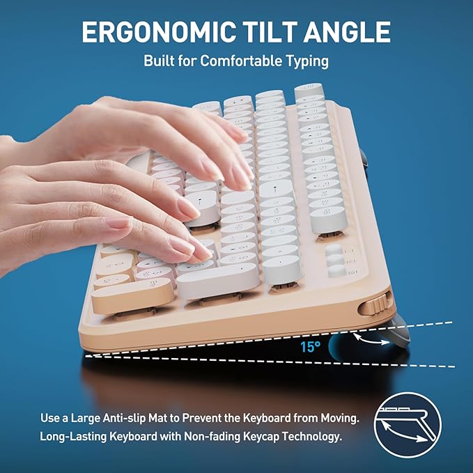 • 💞【Retro Round Keycaps & Silent Wireless Mouse】 keyboard and mouse wireless with vintage typewriter-inspired rounded keycaps, gives you the most comfortable typing experience and adds some much needed spunk to your desk.This cute mouse provides whisper-quiet clicking, don't worry about disturbing others, or causing unnecessary distracting noises.