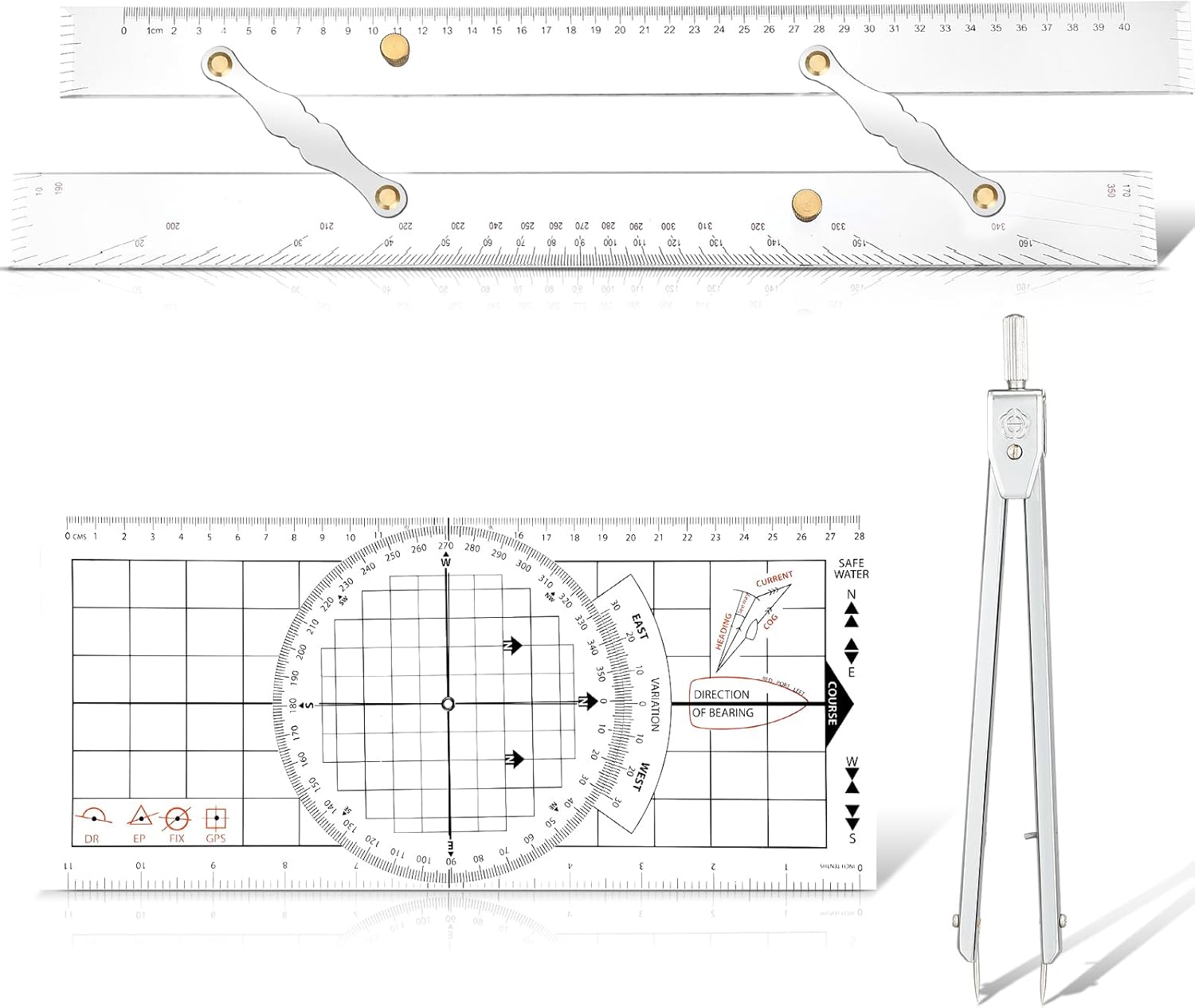 • Comprehensive Navigation Kit: this basic navigation set includes 1 marine nautical protractor, 1 piece of 16 inch marine parallel ruler, and 1 piece of 6 inch marine navigation fixed point divider; A comprehensive package for all your navigation tasks