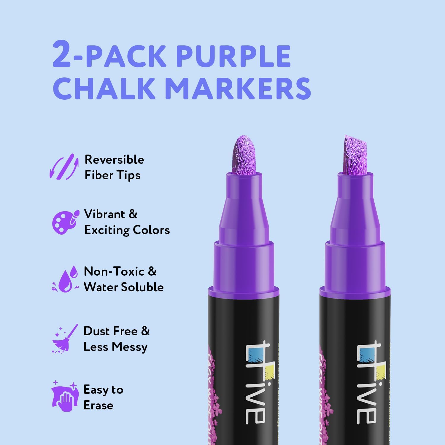 TFIVE Purple Liquid Chalk Markers - 2 Pack Bright Colors Erasable Chalk Marker Pens, Reversible Tip, Non-Toxic, for Chalkboards, Signs, Glass, Easy to use Chalk markers TF800