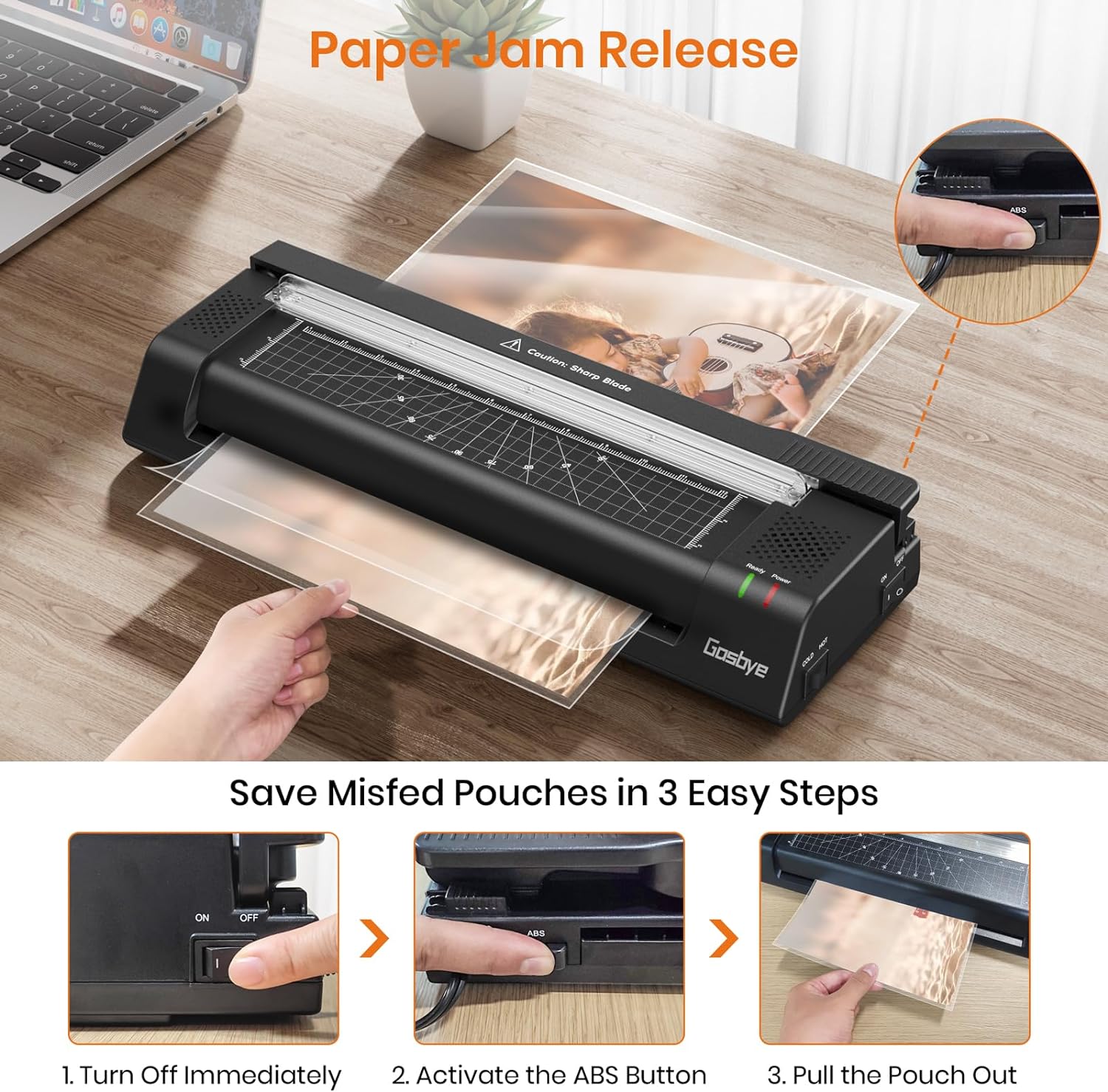 • 【Effortless Paper Jam】When misplacement during lamination causes a jam, simply press the ABS film retrieval button to pull out the laminating pouch, saving crucial documents or photos. It's an easy and hassle-free operation that won't have any impact on your machine.