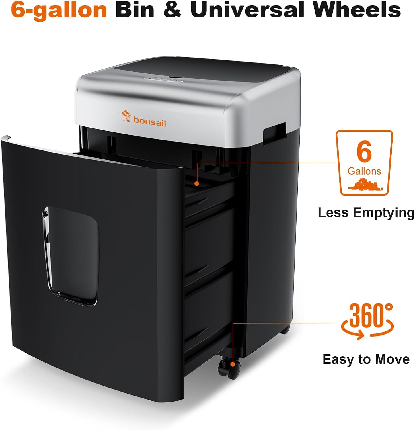 • Large Capacity & Easy to move: 6-Gallon pullout bin reduces the frequency of emptying. With 360-degree universal casters, you can move the heavy duty shredder freely.
