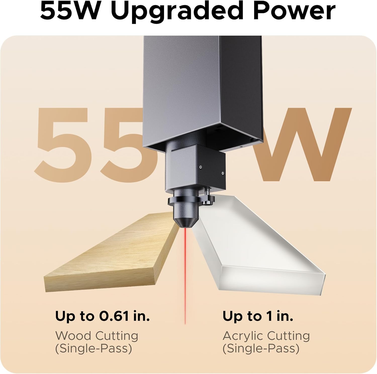 • Desktop DIY Lasering: OMTech's 55W Polar Lite desktop laser engraver engraves, cuts, and shapes wood (up to 0.61"), acrylic (up to 1"), leather, fabric, cardboard, & coated metal, turning your ideas into reality at speeds up to 500 mm/s