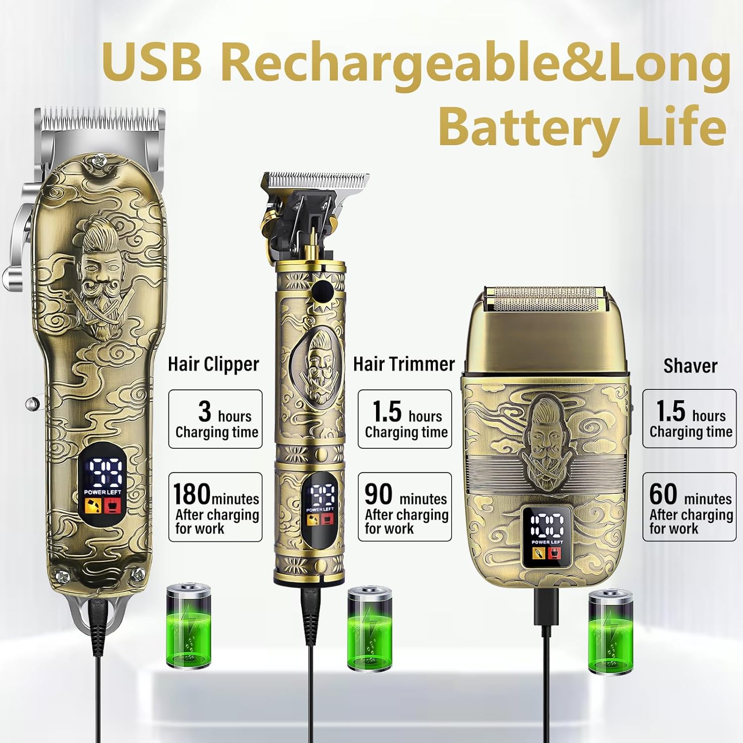 • USB Rechargeable and Long Battery Life:Offers up to 180 minutes of running time with charging 3 hours for the hair clipper. 90 minutes of running time with charging 1.5 hours for the detailed trimmer.Hair shaver which can provide 60 minutes of operation time with only 1.5 hour of charging.USB charging port, you can connect USB adapter, laptop, car charger