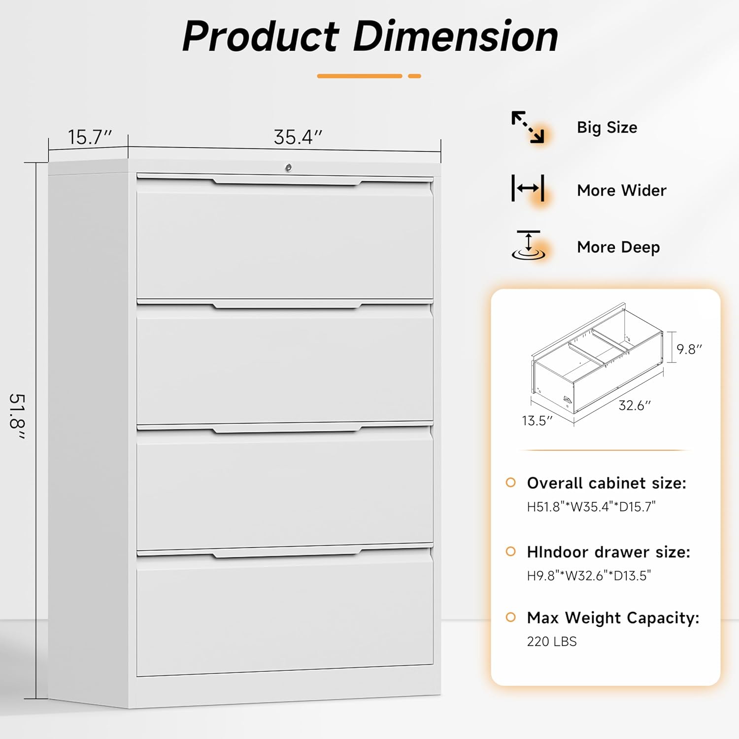 • 🪅【LARGE CAPACITY FOUR DRAWER】Our 4 drawer lateral file cabinet has a huge storage space, 51.8" high * 35.4" wide * 15.7" deep. And it comes with an adjustable hanging rod to store different types of files, such as letter, legal, A4, F4 and other size folders. It is perfect for you to customize the way you organize your files!