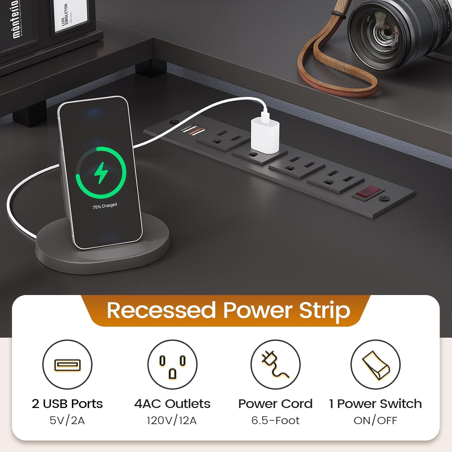 • 【User Friendly】The L shaped computer desk includes a built-in power strip with 4 outlets & 2 USB Ports provides convenience for charging your gaming gear, tablet、printer or phone.Don't worry about not having enough power sockets. Also includes an on-off switch, thanks to the on-off switch, one-button power off to ensure safe electricity use, which strengthens security.