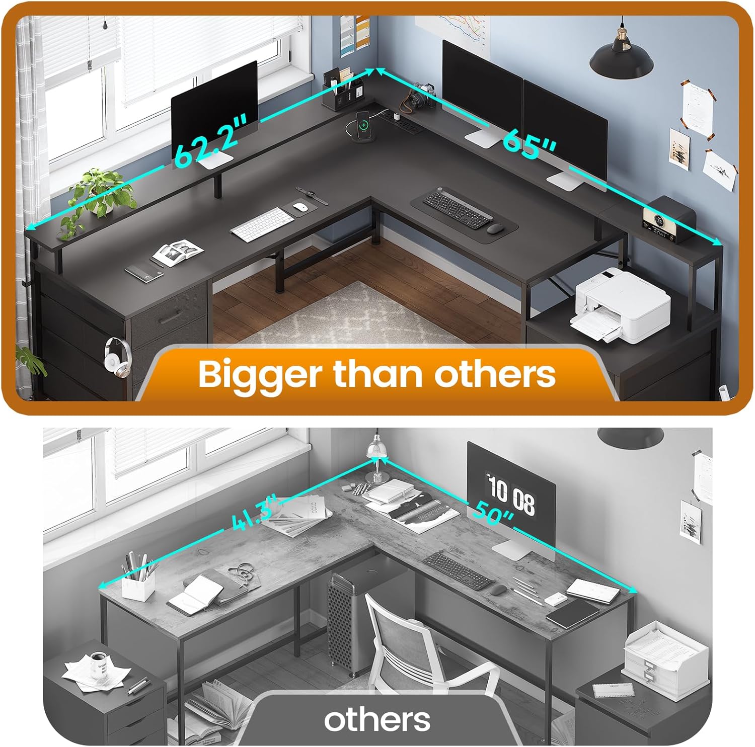 • 【Ideal Space】This computer desk has a spacious desktop. The desktop size is 65"L*19"W and 62.2"L*19"W or 108 inch two person desk. The printer rack can be used for printers of any size commonly seen on the market. The L shaped computer desk could hold three desktop computers and one notebook computer. This computer desk can also be freely deformed into a long square or L-shaped desk according to your use needs.