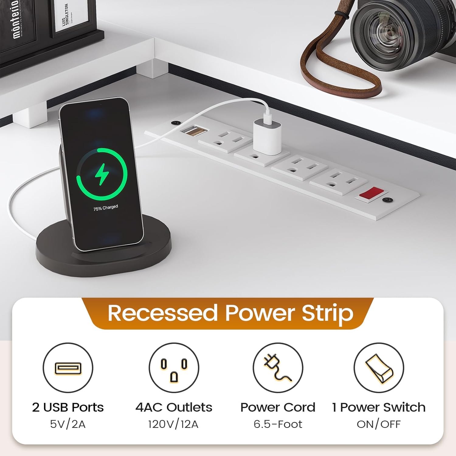 • 【User Friendly】The L shaped computer desk includes a built-in power strip with 4 outlets & 2 USB Ports provides convenience for charging your gaming gear, tablet、printer or phone.Don't worry about not having enough power sockets. Also includes an on-off switch, thanks to the on-off switch, one-button power off to ensure safe electricity use, which strengthens security.