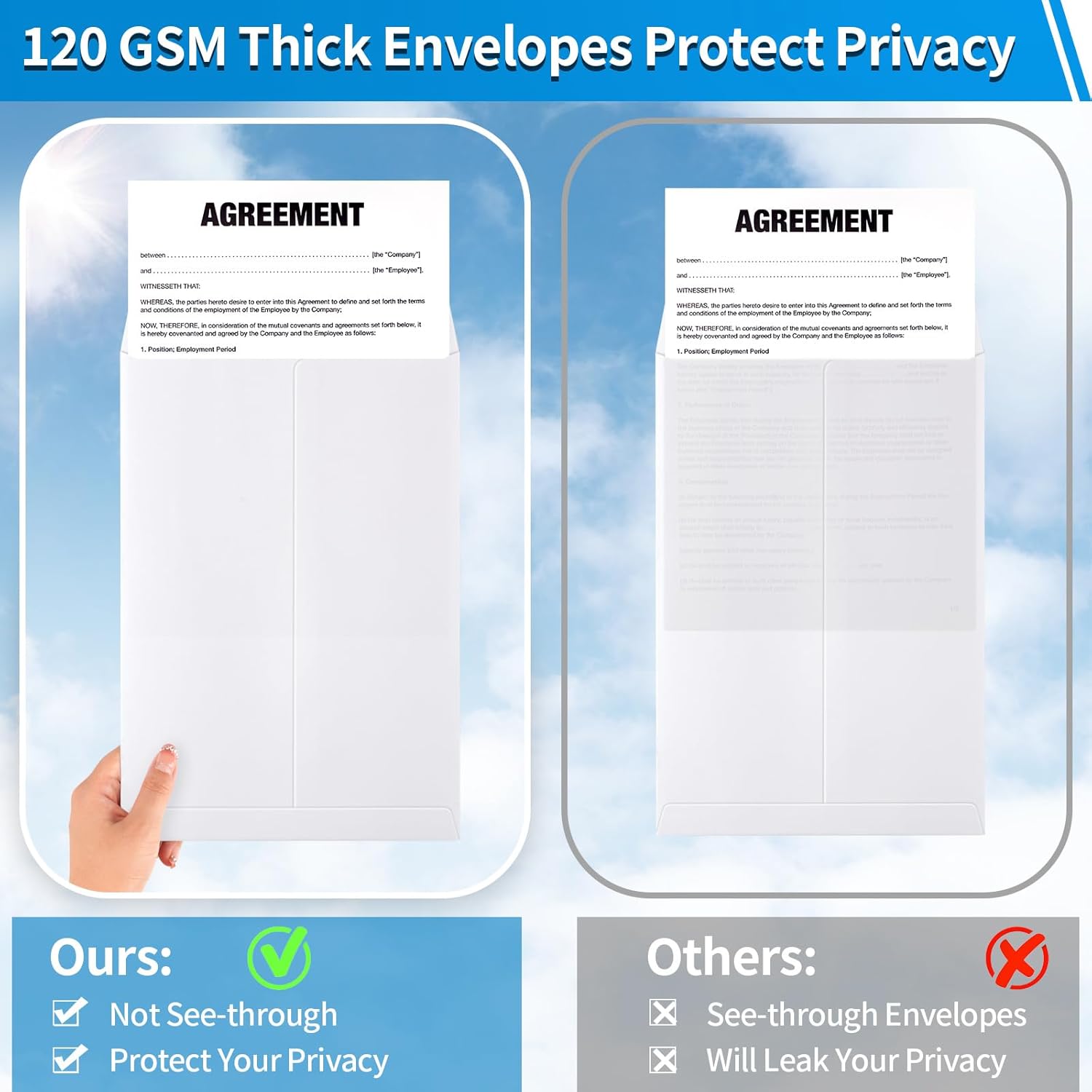 • 【Thick and Sturdy】The white manila envelopes are made of 100GSM double adhesive paper, which has excellent rip, tear and puncture resistance, catalog envelopes strong, thick and opaque. Perfect for obscuring sensitive information and protecting critical documents. Ideal for for secure business mailing.