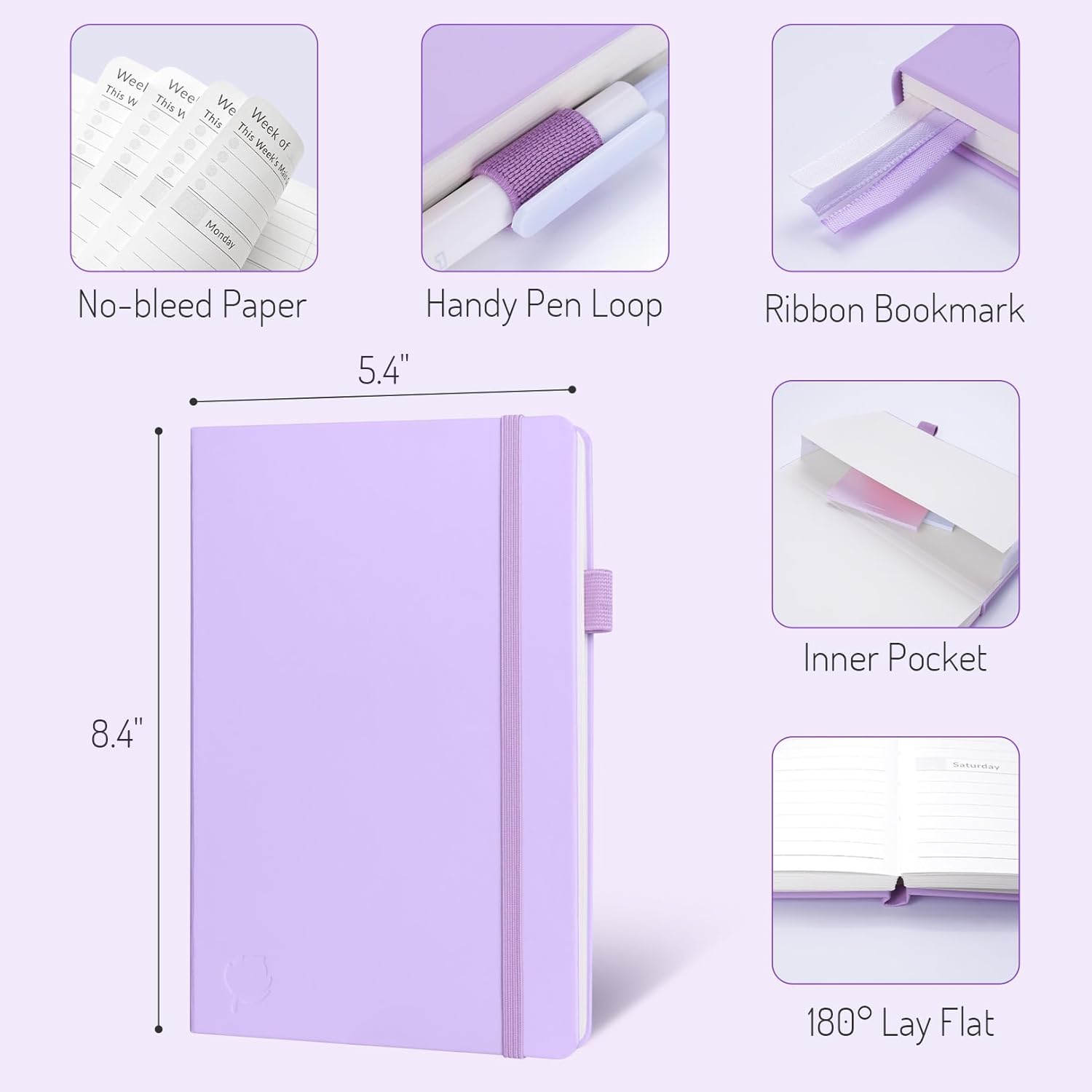 • Trusted Quality for Full Year Use: Adopted 100GSM thick paper for easy writing and preventing ink bleeding. Measuring 5.4" x 8.4", perfect size to fit in your purse or backpacks and take anywhere. Our cute planner also features an inner pocket, pen loop, and ribbon bookmarks.