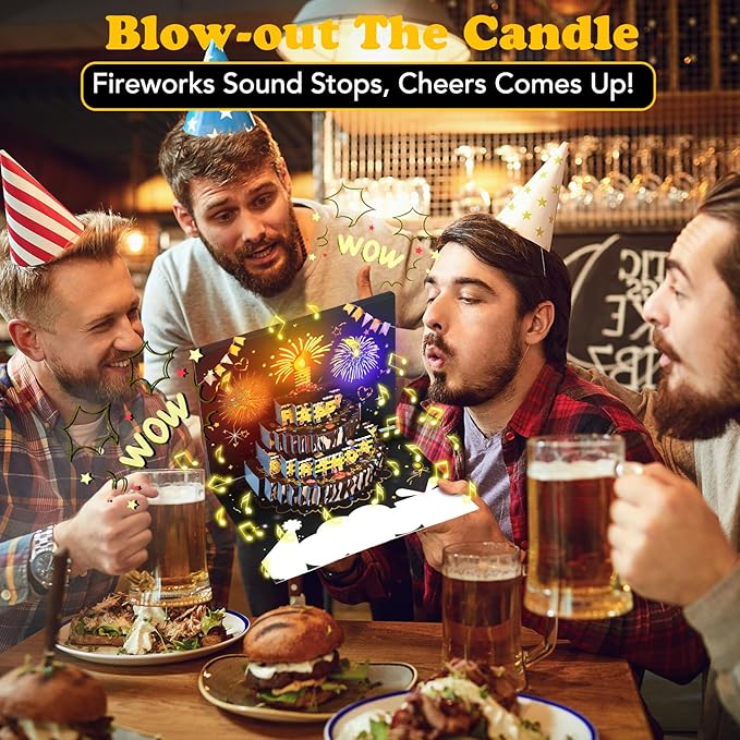 • 3D Pop-Up & Multisensory Experience: ​ Opening reveals a vibrant 3D birthday cake with colorful LED fireworks, accompanied by "Happy Birthday" music and realistic firework sounds.