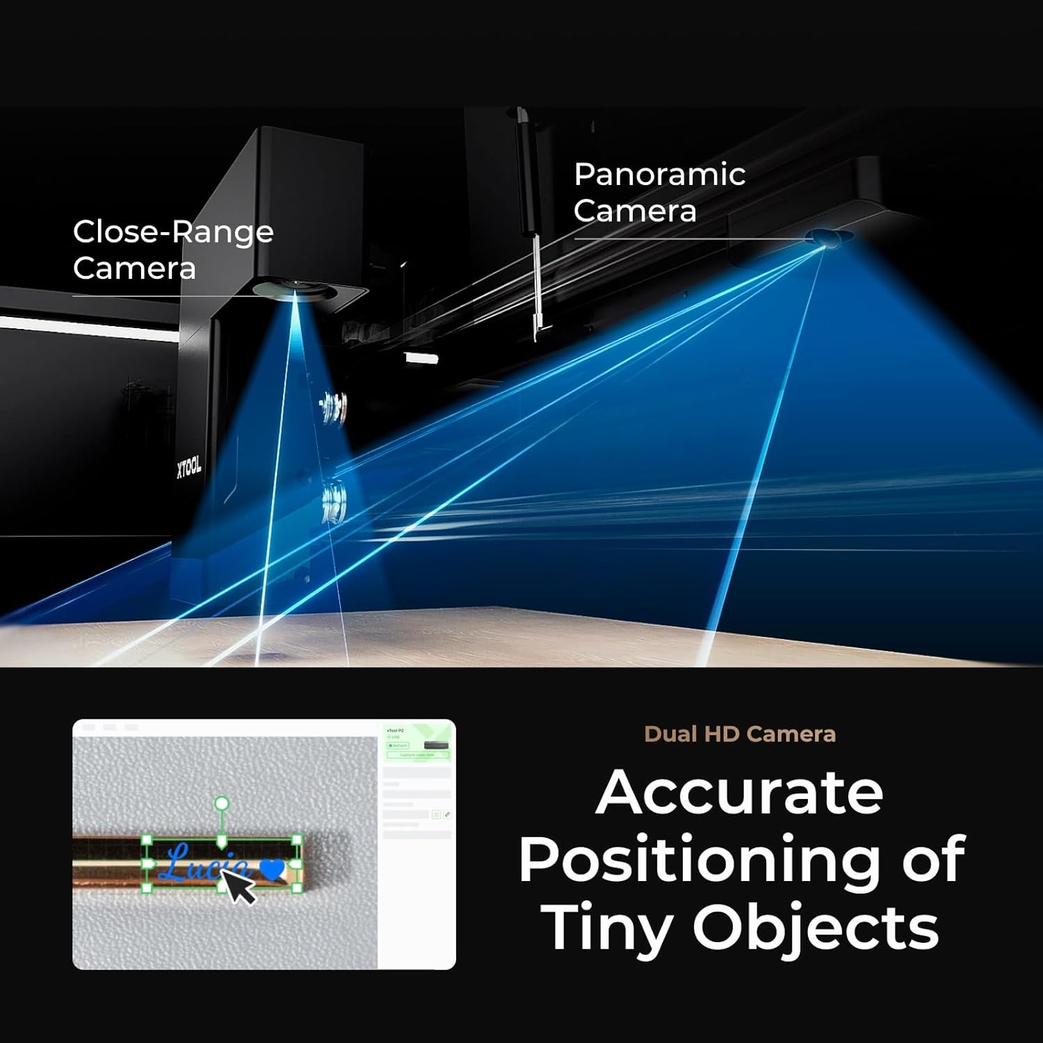 • Intelligent Desktop Laser Cutter & Engraver: Thanks to the dual 16MP smart cameras, xTool P2 CO2 laser engraver can automatically construct 3D models of curved objects to make curved surface engraving as perfect as flat, can intelligently recognize shapes to fill pattern on multiple objects and engrave them in one batch. If assembled with the Automatic Conveyor Feeder, xTool P2 also provides the automatic passthrough for precision and convenience when engraving and cutting extra-large materials.