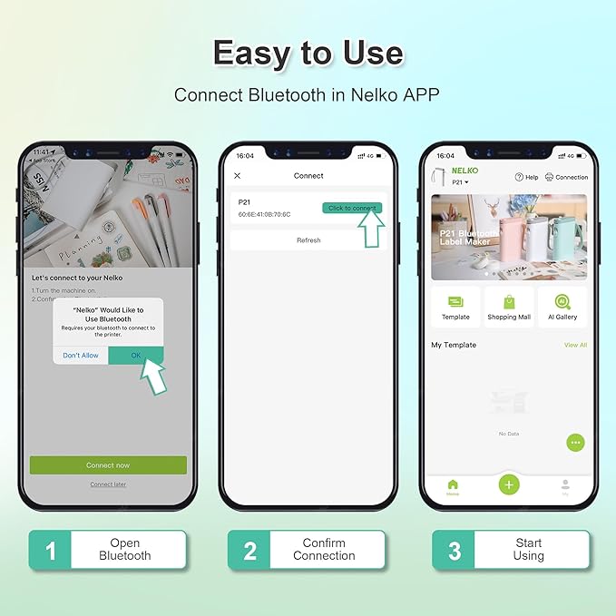 • Easy to Use: NELKO label printer compatible with IOS & Android Phone via bluetooth connection. Step 1: Download "Nelko" APP from Google Play or App Store. Step 2: Install the paper roll. Step 3: Connect the P21 bluetooth within APP. Step 4: Choose a quick template and start printing. It is not compatible with Google phones on Android 14. This label maker machine with tape APP included more than 90 +Fonts, 10+ Languages, 450+ Materials. (Note: This label maker doesn't work with computers)