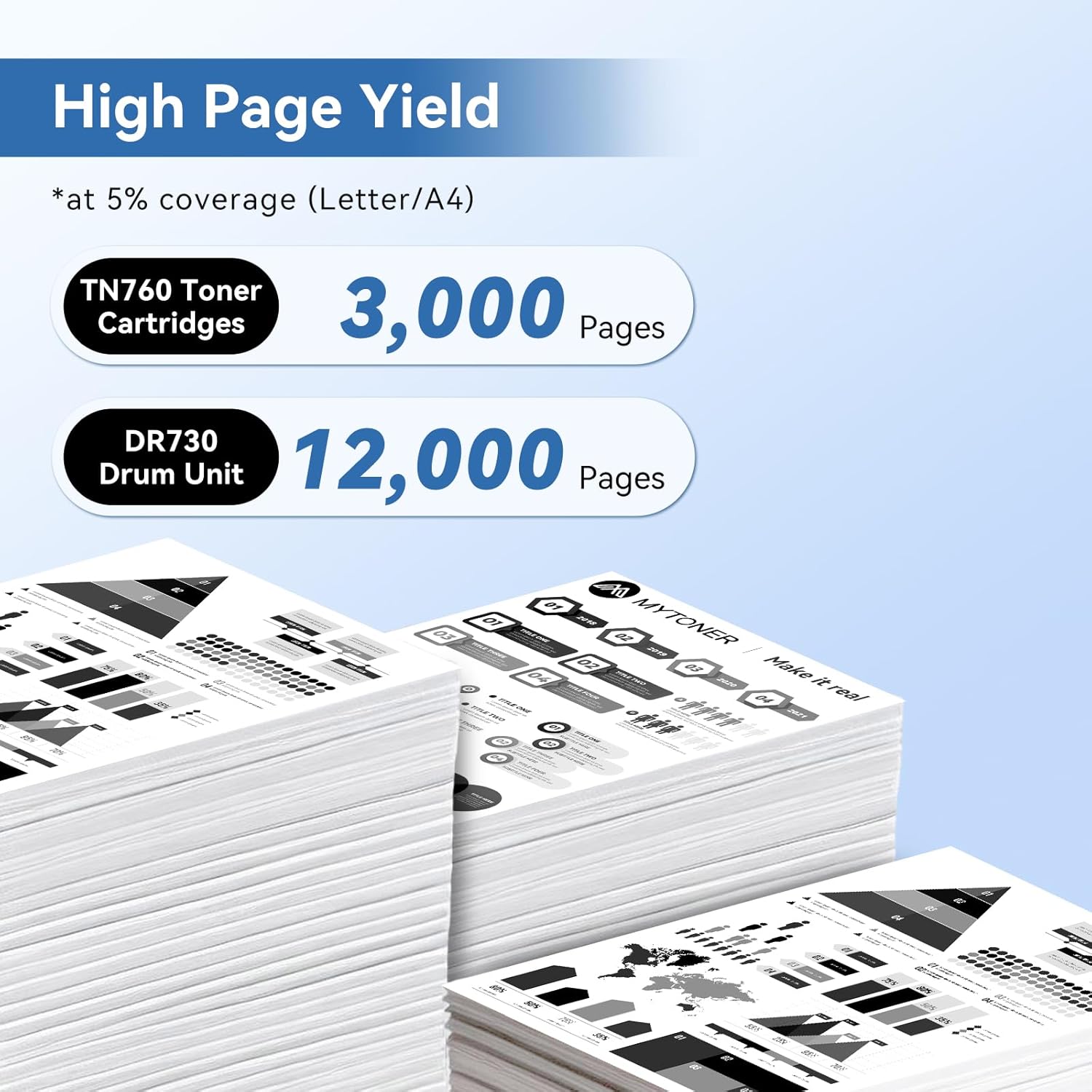 • Estimated Page Yield: Each TN 760 Toner Cartridge Can Print Approximately 3,000 Pages and Each DR730 Drum Unit Can Print Approximately 12,000 Pages (At 5% Coverage - Letter/A4)