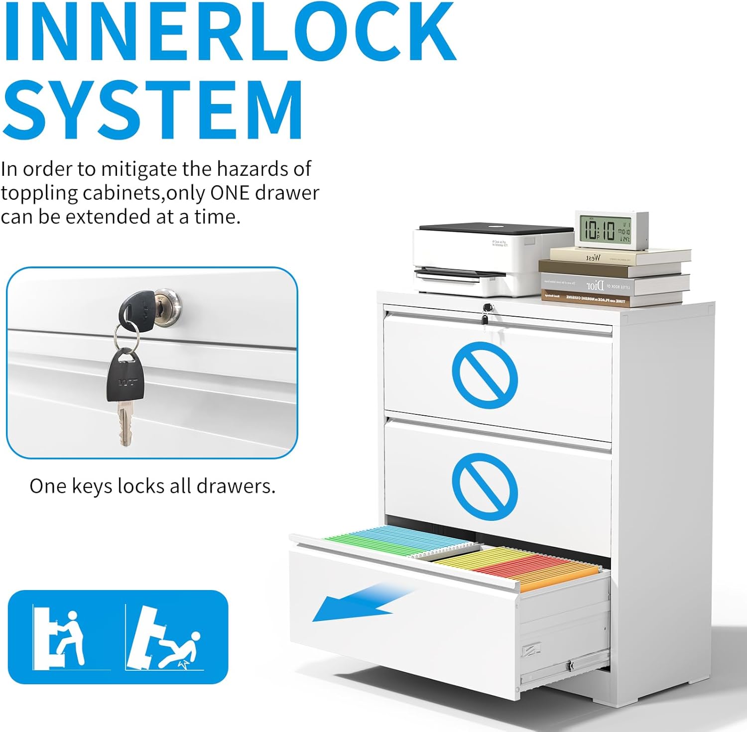 3 Drawer Lateral File Cabinet with Lock, Metal Lateral Filing Cabinet for Home Office, Steel Wide Horizontal Filing Cabinets for Letter/Legal/A4/F4 Hanging Files (White)