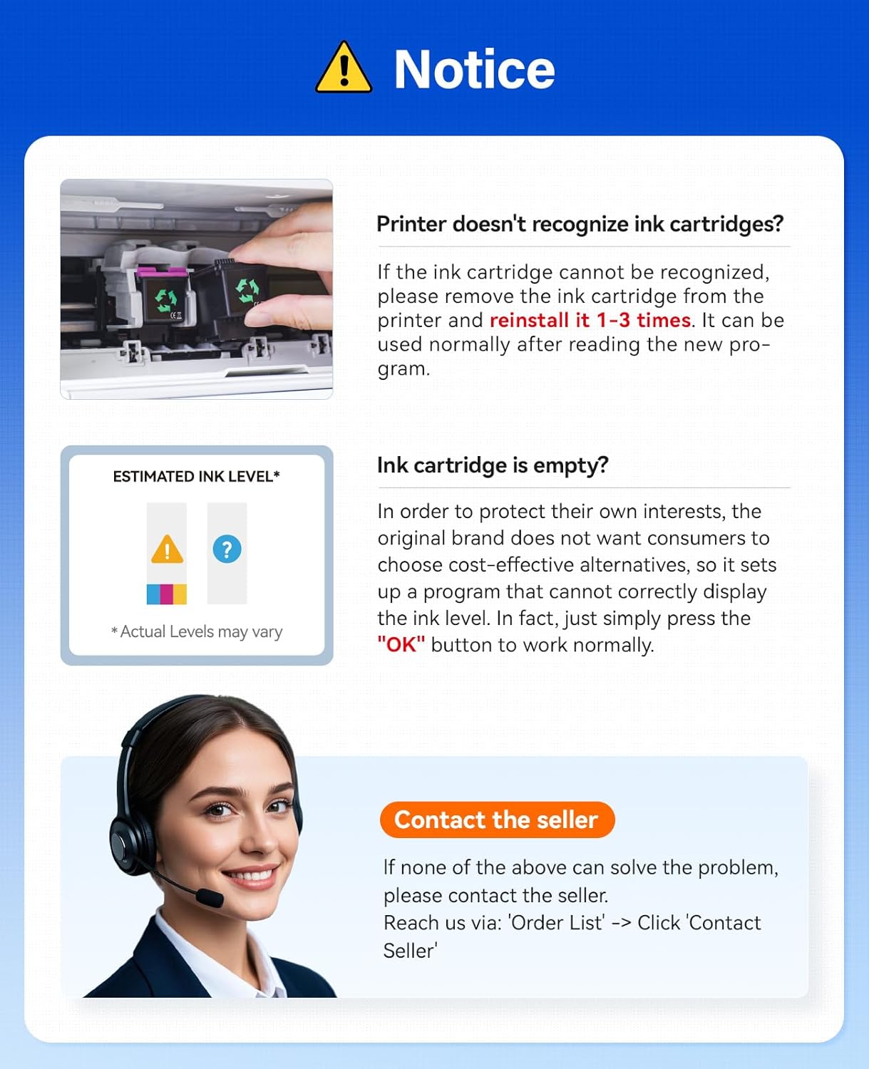 • Warm Tips: When occur an error message "Replace Cartridge" or "low ink"? Please reinstall them and try, you can try up to 3 times