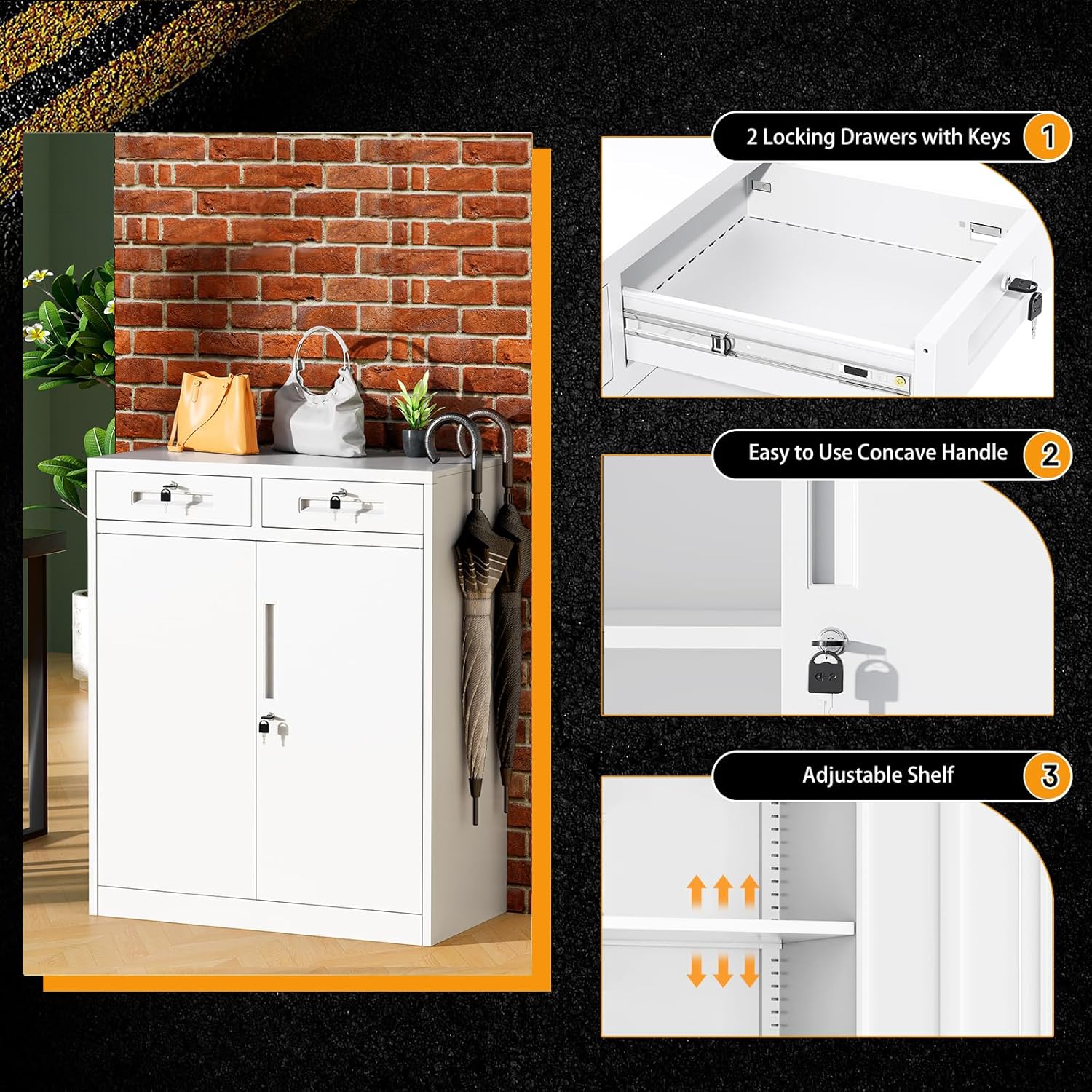 • [𝗨𝗣𝗚𝗥𝗔𝗗𝗘𝗗 𝗟𝗢𝗖𝗞𝗜𝗡𝗚 𝗦𝗬𝗦𝗧𝗘𝗠] -- Greenvelly metal storage cabinet adopts a new upgraded and safer three-point interlocking system. Multiple locked areas such as two drawers can store different tools or files. The lockable metal storage cabinet provides higher security for your important items and documents, making it perfect for use in offices, garages, and schools.