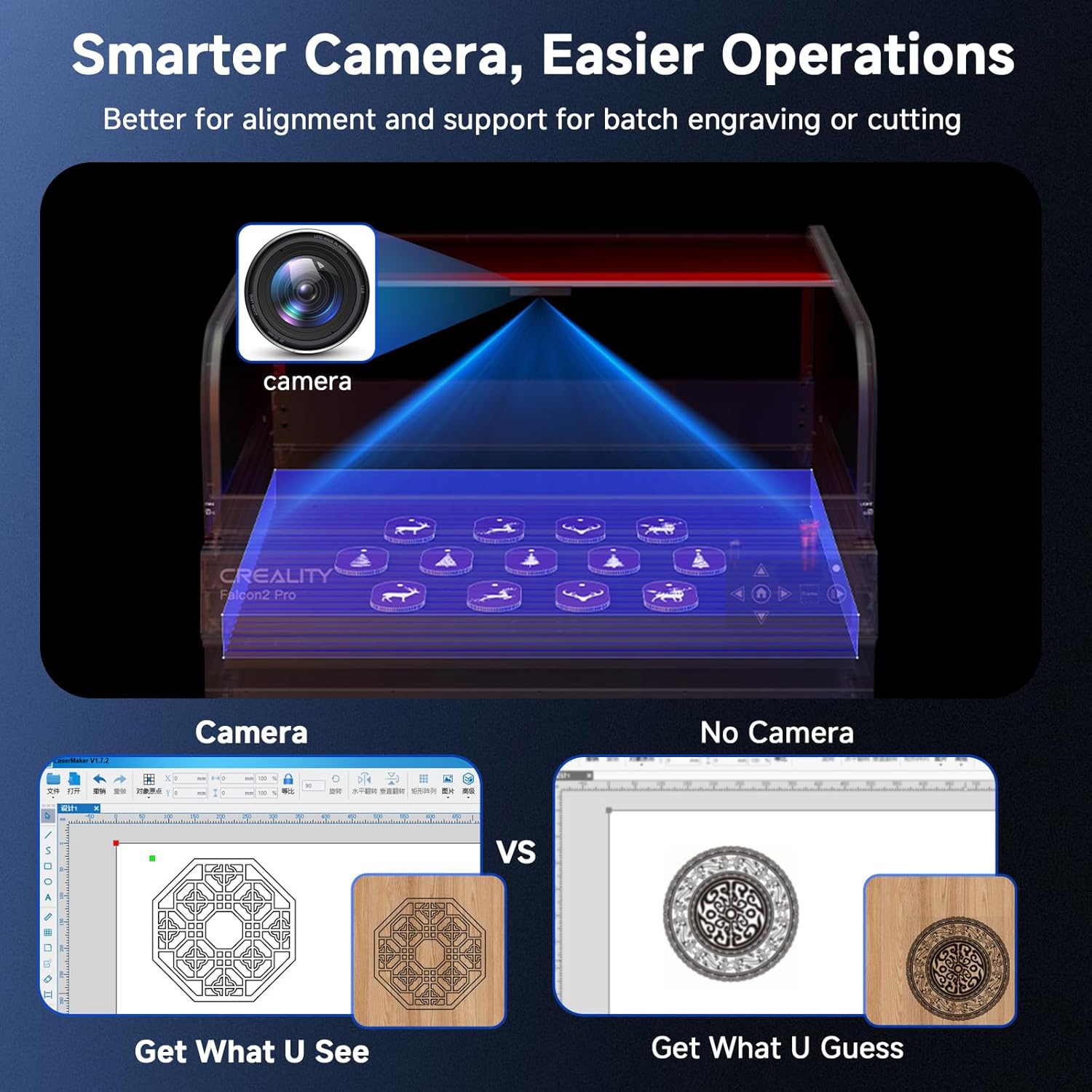 • 【New Camera Positioning】Falcon2 Pro series engraving machine new camera positioning function, you need to connect to the computer, follow the installation steps to set up the parameters related to the camera, you can call up the camera on the software to use (only connect to the computer to use). The camera function can provide better pattern positioning, and more games are expected to be unlocked by the enthusiasts.