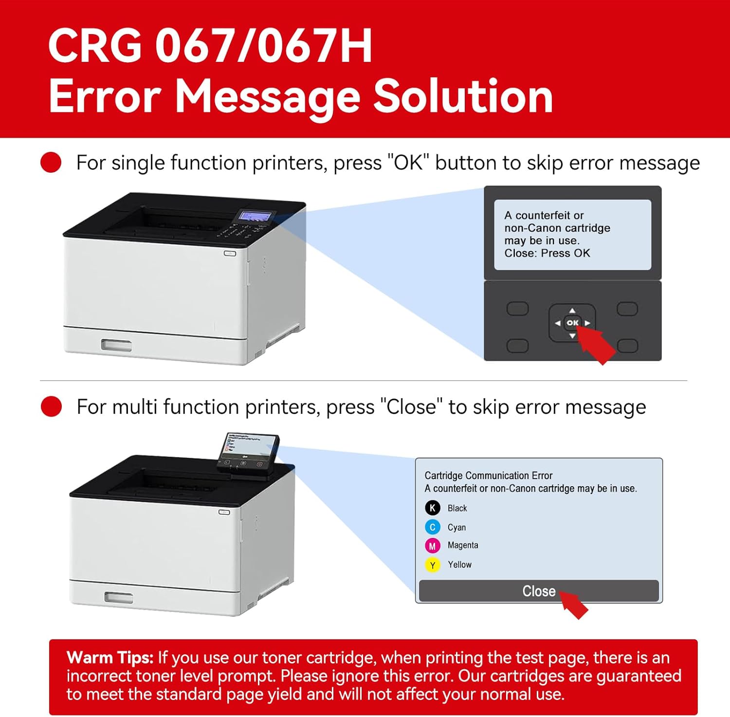 • Package Contents: 4 Pack 067H Toner Cartridge Set compatible replacement for Canon 067H 067 Toner Cartridge High Capacity (1 x cartridge 067H Black toner, 1 x cartridge 067H Cyan toner, 1 x cartridge 067H Magenta toner, 1 x cartridge 067H Yellow toner)