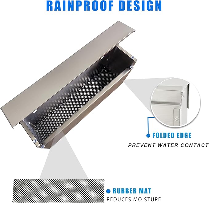 • NO MORE WET MAILS: Our waterproof mailbox has folded edges covering the top of the stainless steel wall mount mailbox, so raindrops will drip down naturally and not get inside the mail box, keeping your items clean and dry. In addition, we include a rubber mat to keep moisture away.
