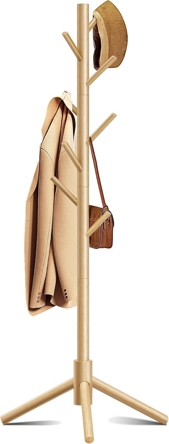 Wooden Coat Rack, Free Standing Coat Rack with 8 Hooks 3 Adjustable Heights for Clothes, Hats, Handbags, Coat Tree Easy Assembly for Entryway, Bedroom, Hallway, Office (New Nature)