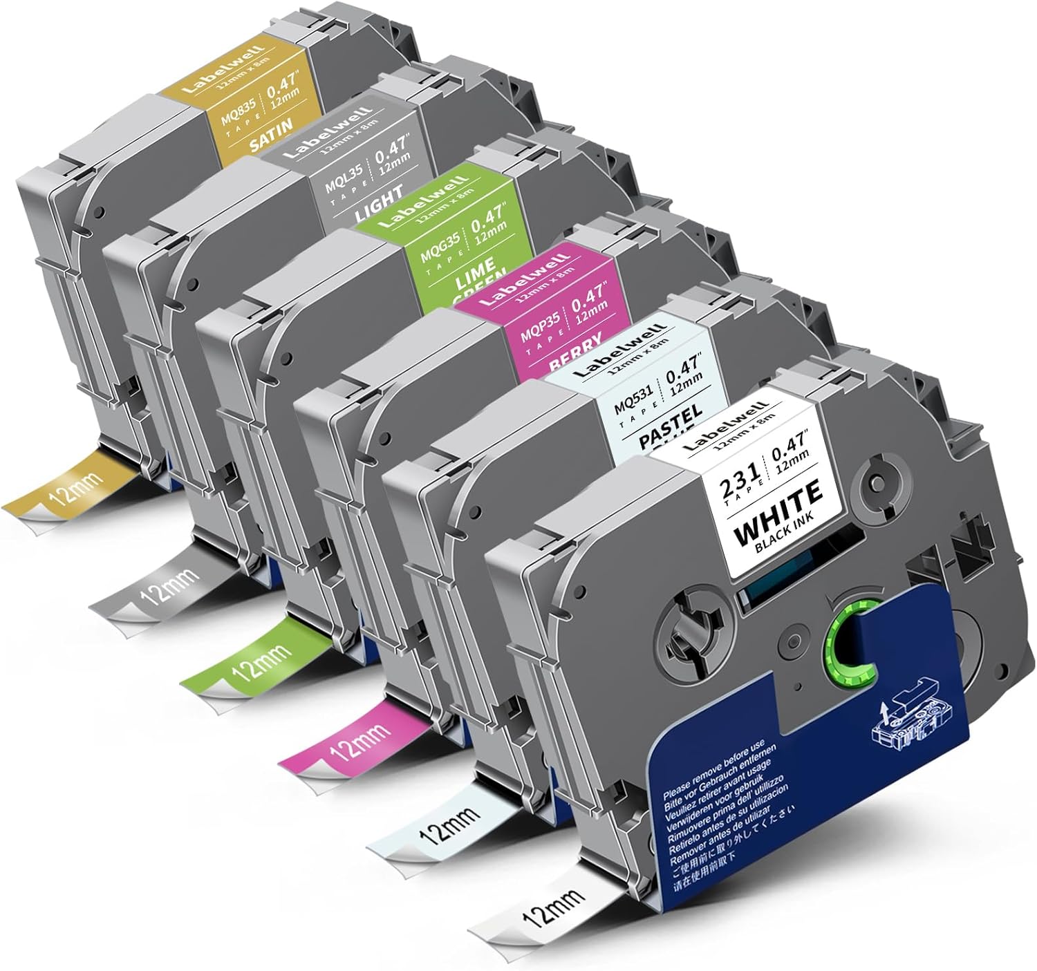 • Package Contents: 6-Pack Replacement for Brother P Touch Label Tape TZe-231 (Black on White), TZe-MQ531 (Black on Pastel Blue), TZe-MQP35 (White on Pink), TZe-MQG35 (White on Lime Green), TZe-MQL35 (White on Sliver), TZe-MQ835 (White on Gold), total 6 packs