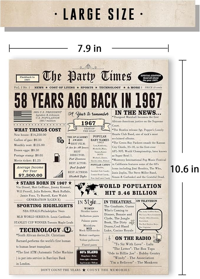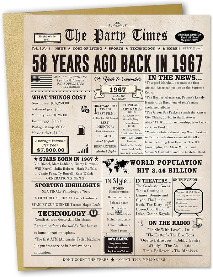 • 【58th Birthday Decorations for Women】This is a good topic. It's interesting to see how much everything cost back then, to see what happened back then.