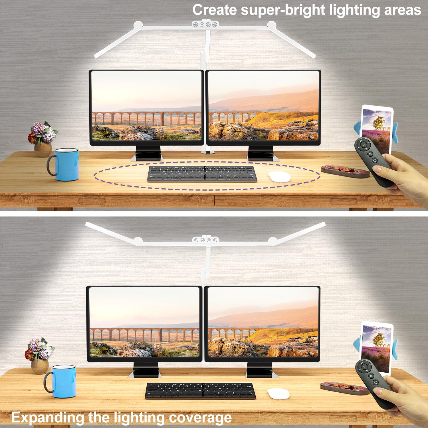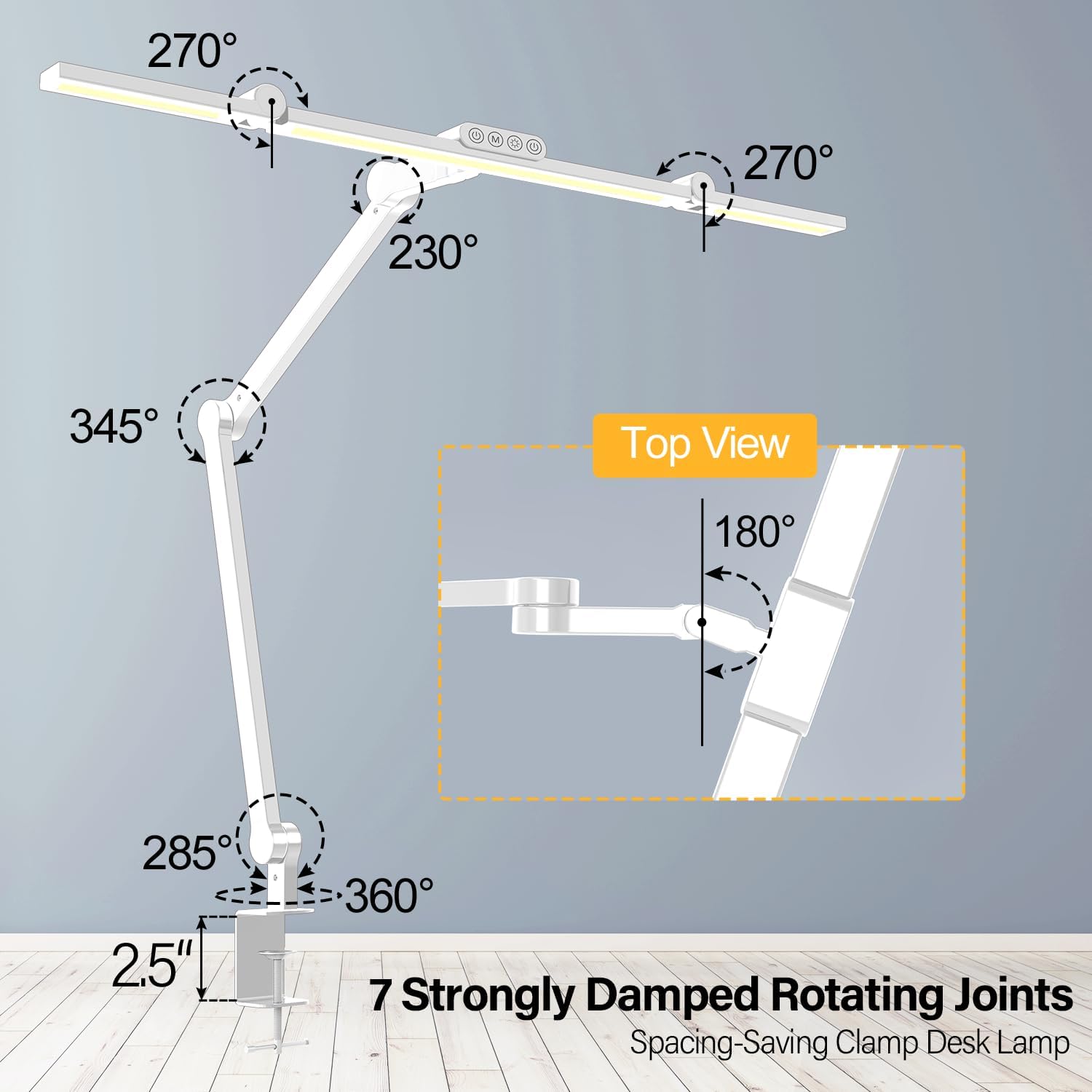 • 【7 Rotatable Joints】: Micomlan swing arms led desk light features 7 strongly damped joints with 3 ultra bright light bars design for freely vertical adjustment and horizontal adjustment. You can rotate the bilateral light bars vertically to change the illumination angle. Turn them up to expand the lighting coverage to illuminates your entire desk or turn them down to create a super bright lighting area for sewing crafting. You can also rotate the base to adjust the light direction and position.