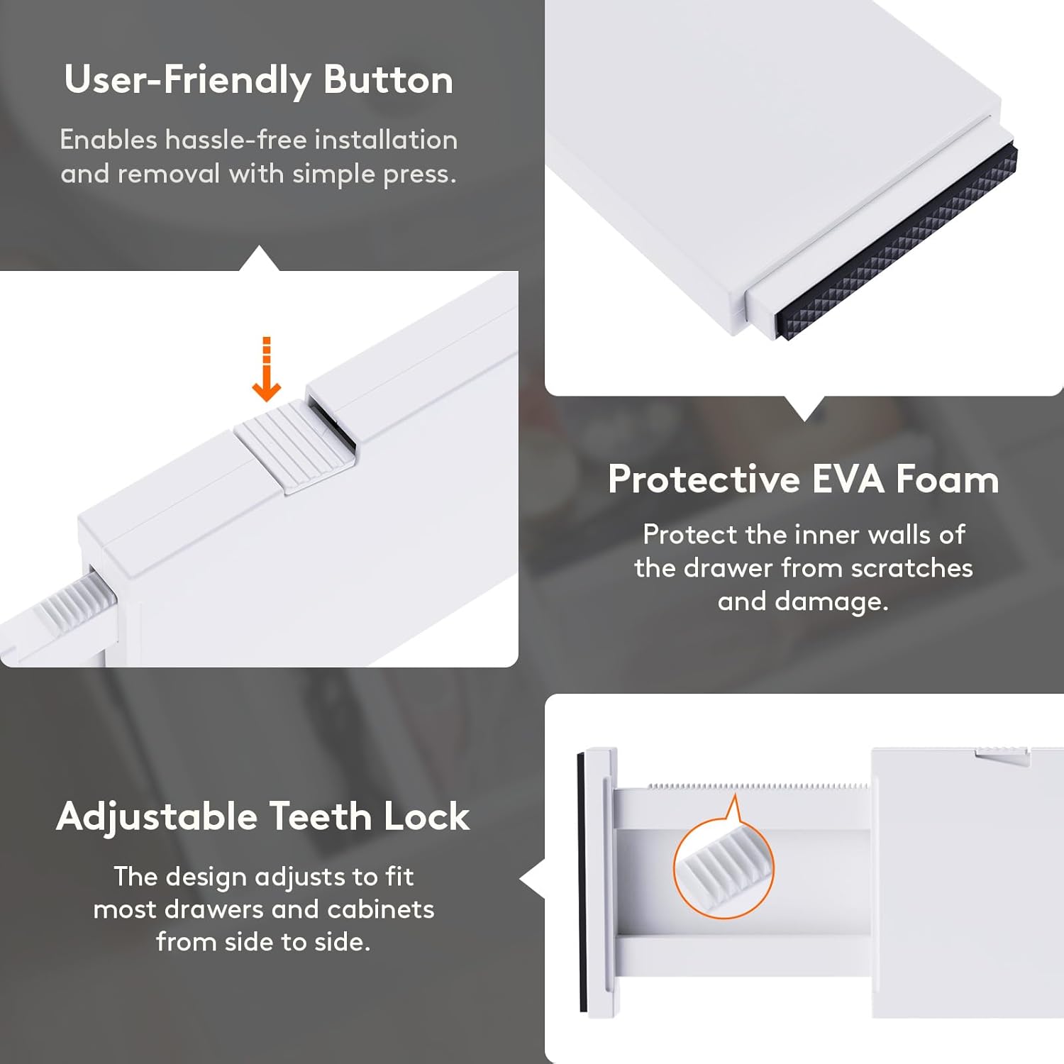 • Stable Installation: Simply press the top button to adjust the length before placing it. After placing, secure it tightly by stretching it out again. The strong spring tension ensures that each dresser organizer stays securely upright. To retract, press the button and push in the stretched side.