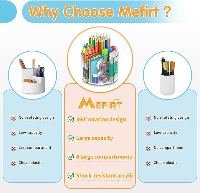 • 360°Rotating Design Pen Organizer: This desktop organizer can be turned to 360-degree rotation, so you can quickly and easily get what you want. Mefirt acrylic desk organizer lets you keep all your things within reach. The 360-degree rotation saves time when looking for your items and helps maintain the tidiness and organization of your desk.