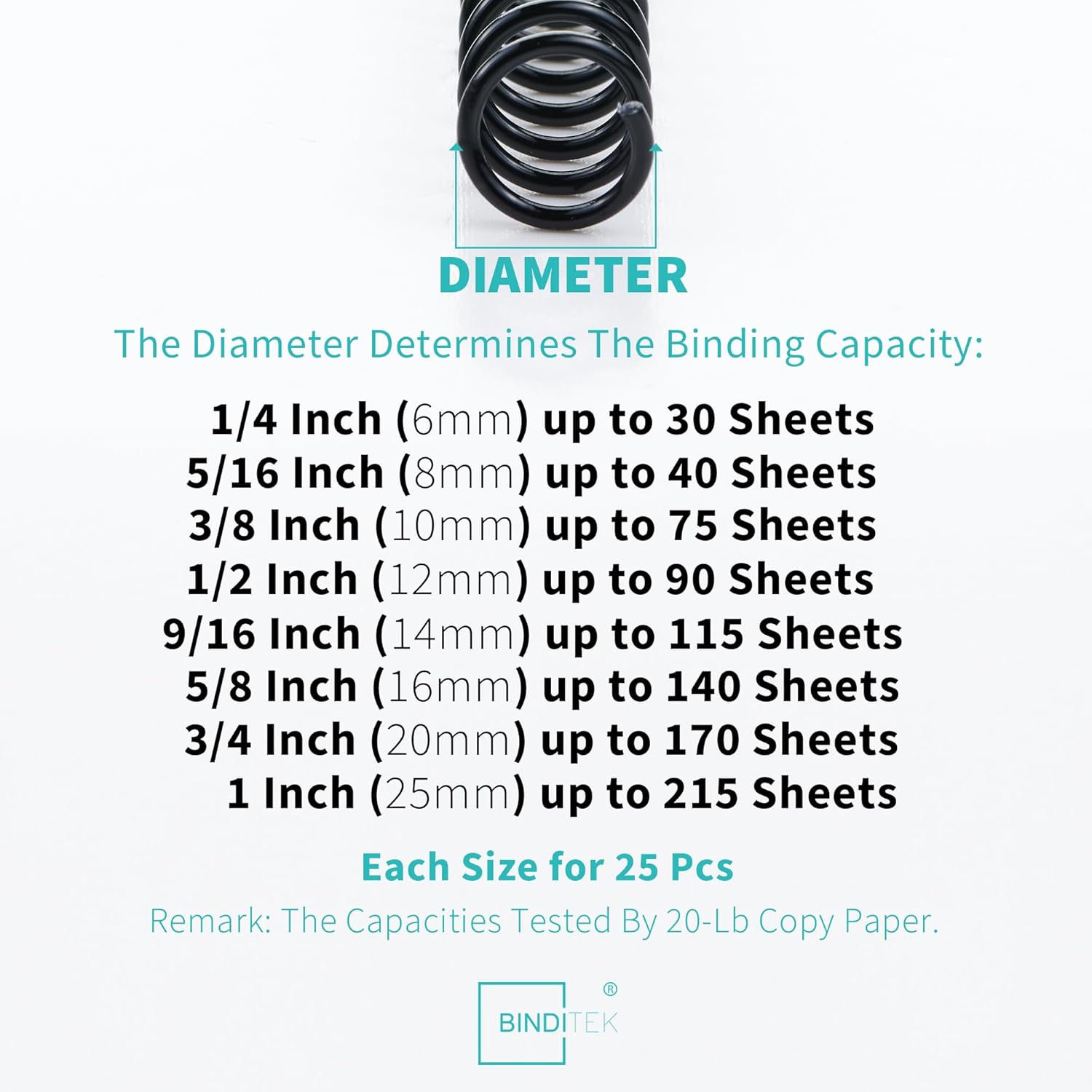 • 【Multi Size For Different Needs】There are 8 sizes of black binding coils in this set, each size for 25pcs, include 6mm(1/4"), 8mm(5/16"), 10mm(3/8"), 12mm(1/2"), 14mm(9/16"), 16mm(5/8"), 20mm(3/4"), 25mm(1"). Each size of binding coil corresponds to a different paper capacity, allowing you to meet various binding needs.