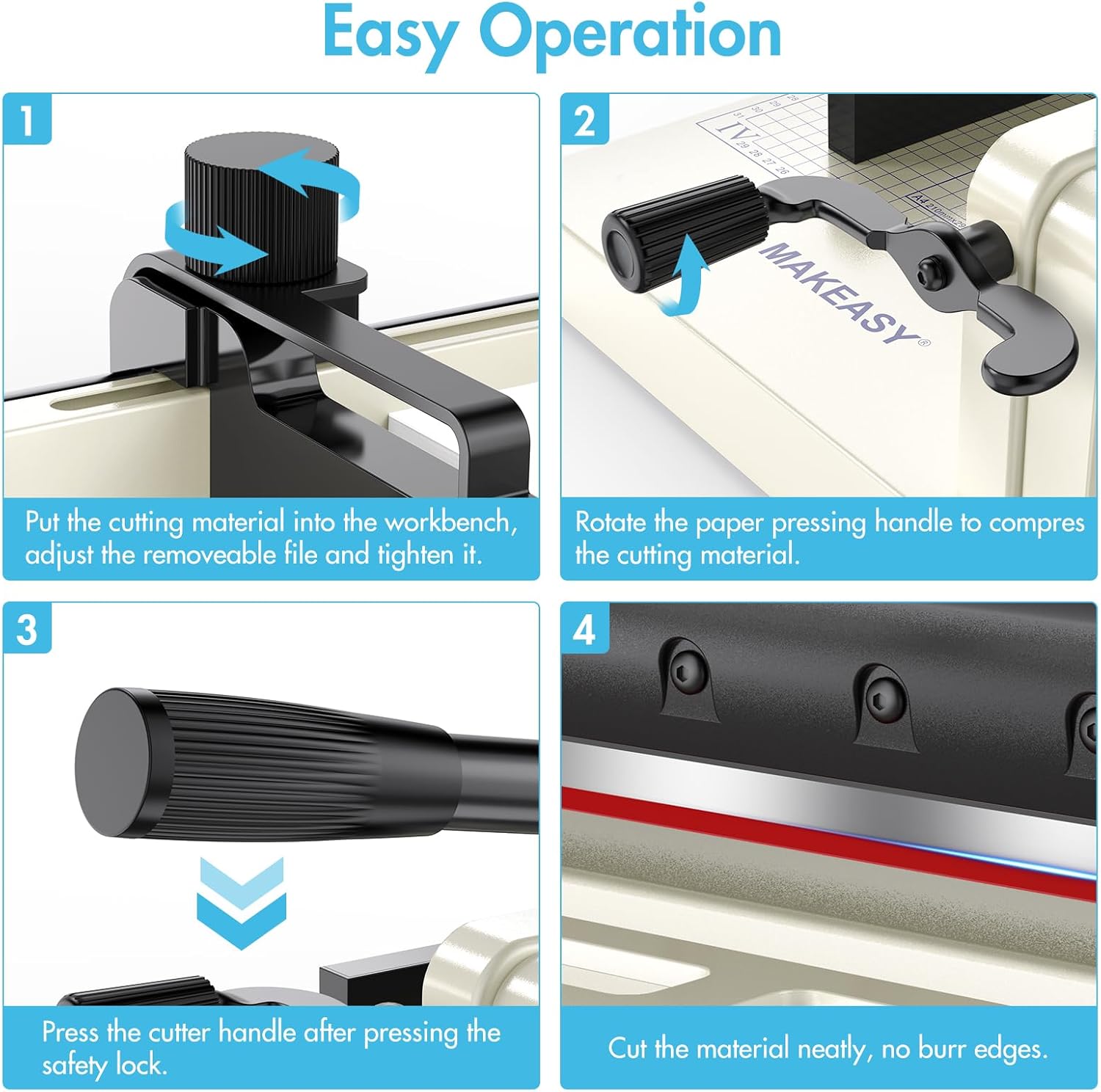 • [Versatile Cutting Capacity] This robust paper cutter effortlessly slices through up to 400 sheets (1.5" thick, A4 size), as well as materials such as PVC, leather, and fabric, meeting diverse cutting demands in homes, offices, schools, and print shops