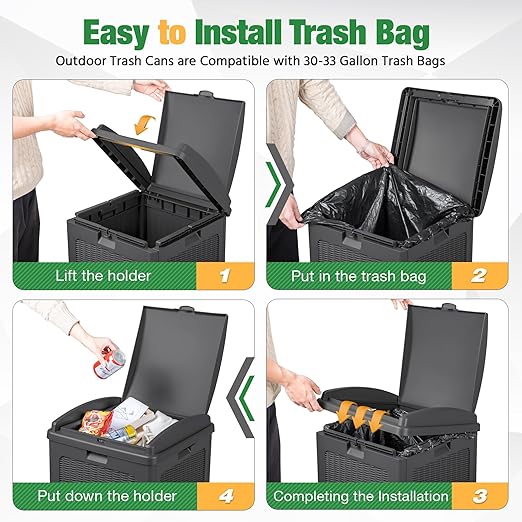 • Easy to Install Trash Bags: The waste bin for outdoors is compatible with 30-33 gallon trash bags. You need to lift the trash bag holder, put on the trash bag, put down the holder, and then finish the installation. After opening the inner lid, the garbage bag can be stably fixed in the card slot.