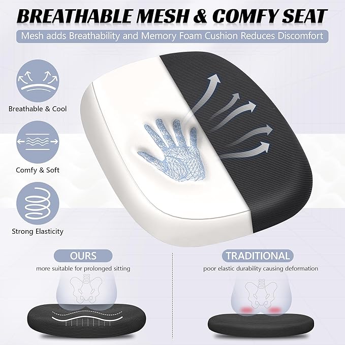 • 【Breathable & Soft】: Imagine sinking into an mesh office chair that feels like sitting on a cloud. Breathable mesh helps with air circulation, and a soft and high rebound cushion, achieves a perfect combination of breathability and comfort, staying cool and comfortable even during the longest working hours.