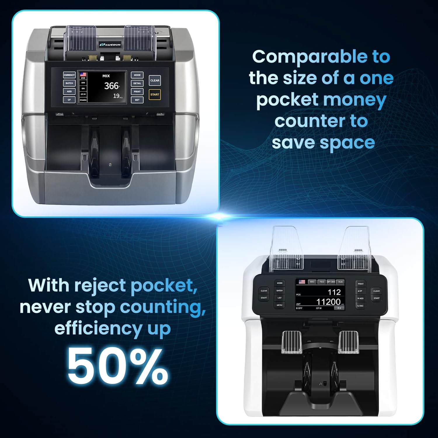 NUCOUN Mixed Denomination Money Counter Machine,Mixed Value Bill Counter and Sorter,with Reject Pocket,Multi Currency Note Counter,Counterfeit Detection 2 CIS/UV/MG/IR,4 inch Touch Screen,SN Record